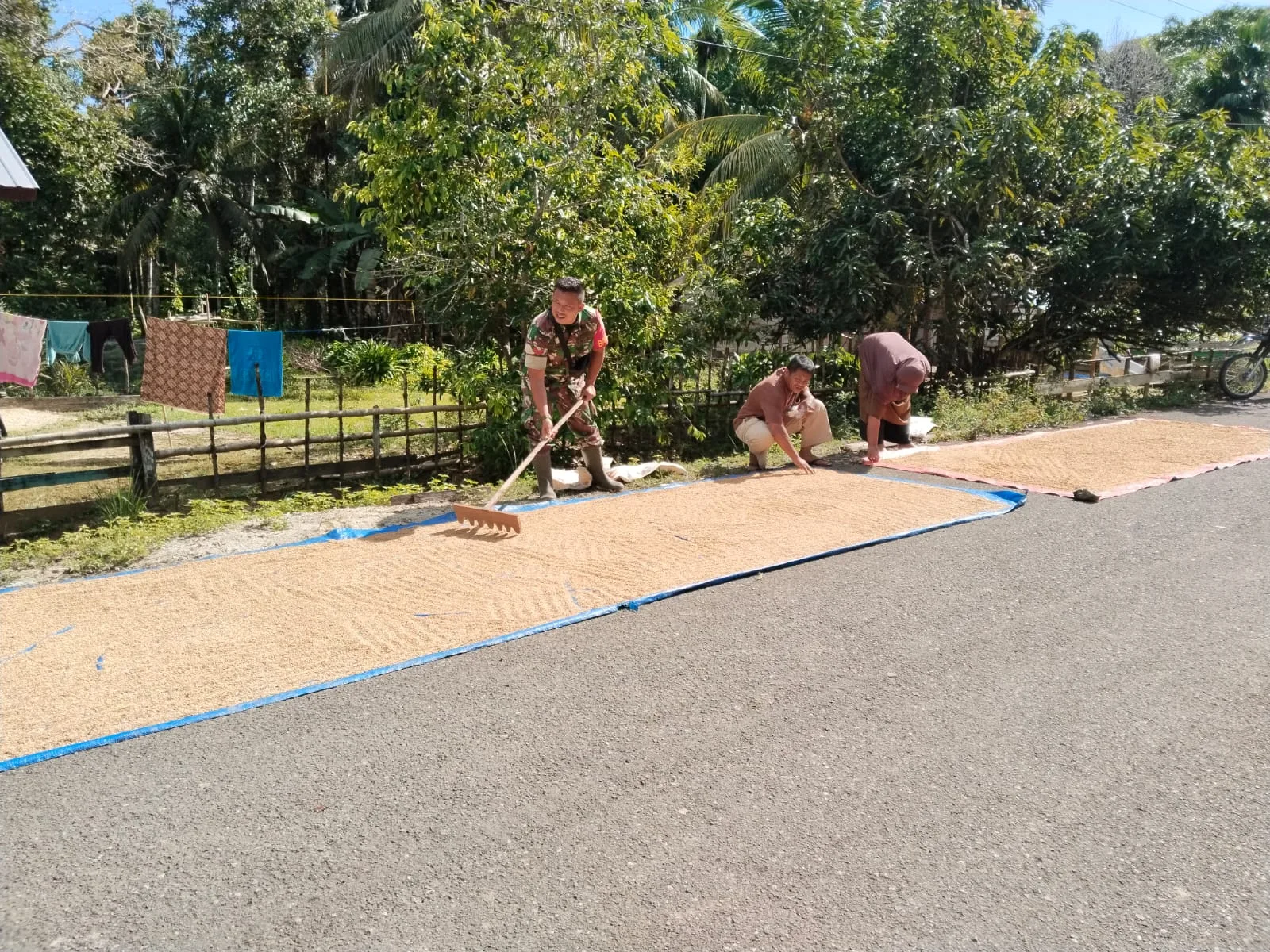 Koptu Ariandi Babinsa Koramil 06/Teluk Dalam, Kodim 0115/Simeulue, Korem 012/Teuku Umar. Melaksanakan komsos membantu warga menjemur padi hasil panen dari sawah mereka sendiri, Kegiatan ini biasanya dilakukan sebelum di bawa ke tempat penggilingan untuk di jadikan beras di Desa Muara Aman, Kecamatan Teluk Dalam, Kabupaten Simeulue. Minggu (03/01/2026).