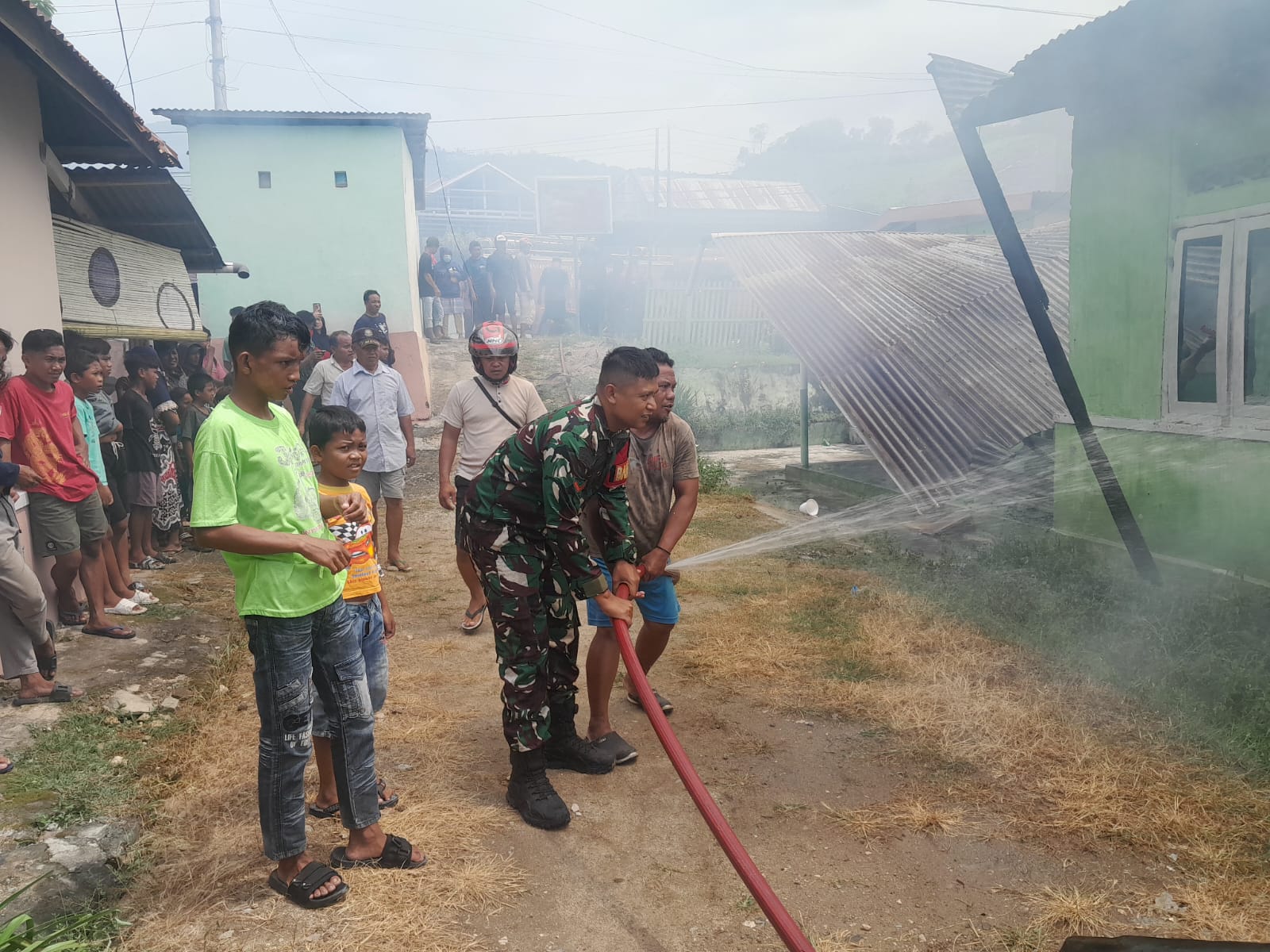 Kebakaran yang terjadi di Kel. Dembe I Kec. Kota Barat Kota Gorontalo pada hari ini sekitar pukul 12.30 Wita tersebut melanda rumah milik Bapak Umar Latif (57). Api dengan cepat membesar dan mengancam rumah-rumah di sekitarnya. Serda Khairul dan Kopda Sutrisno, yang saat itu sedang melaksanakan tugas pembinaan di wilayah binaannya, segera merespons kejadian tersebut.