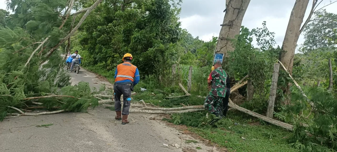 Mengetahui kondisi tersebut, Babinsa dengan sigap mengambil tindakan cepat bersama warga sekitar untuk memindahkan pohon tumbang dari badan jalan. Dengan peralatan seadanya dan semangat gotong royong, pohon berhasil dipindahkan sehingga akses jalan kembali normal dan aman dilalui oleh kendaraan maupun pejalan kaki.