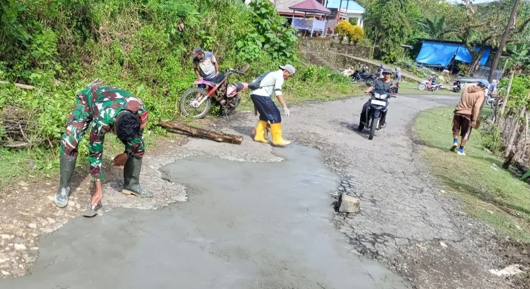 Dalam kegiatan tersebut, Babinsa bersama masyarakat bergotong royong melaksanakan pengecoran jalan yang mengalami kerusakan dan berlubang akibat terkikis air. Jalan tersebut merupakan akses vital yang menghubungkan antar dusun, sehingga perbaikannya menjadi prioritas demi kelancaran aktivitas warga sehari-hari.