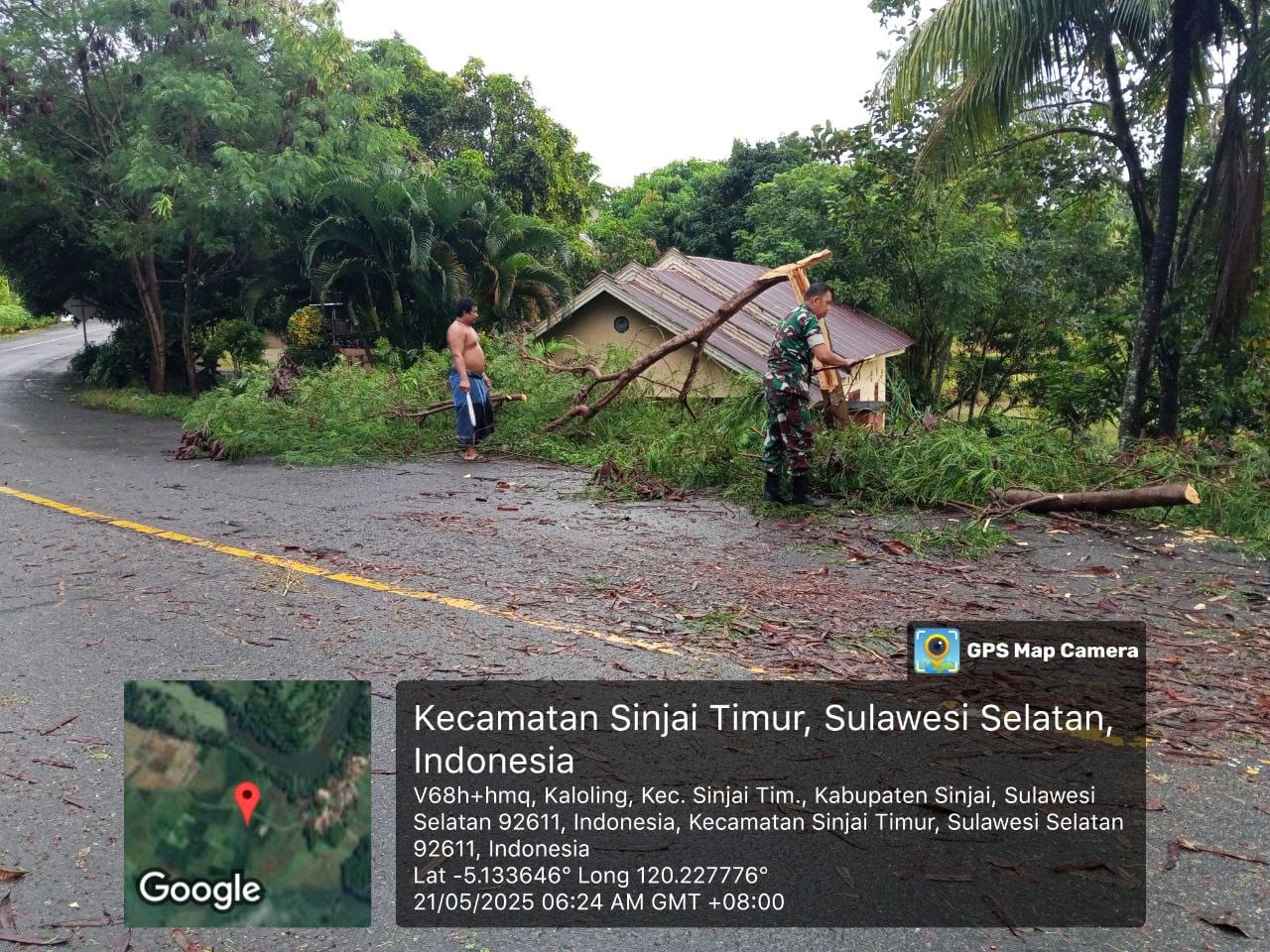 Sinjai – Babinsa Koramil 1424-04/Sinjai Timur, Serda Abd Rasyid, bersama masyarakat Dusun Rombo, Desa Saukang, Kecamatan Sinjai Timur, Kabupaten Sinjai, melaksanakan kerja bakti membersihkan ranting-ranting pohon yang menutup bahu jalan, Kegiatan ini dilakukan sebagai langkah preventif guna menjaga keselamatan pengguna jalan dan menciptakan lingkungan yang bersih dan tertata, Rabu (21/05/2025)
