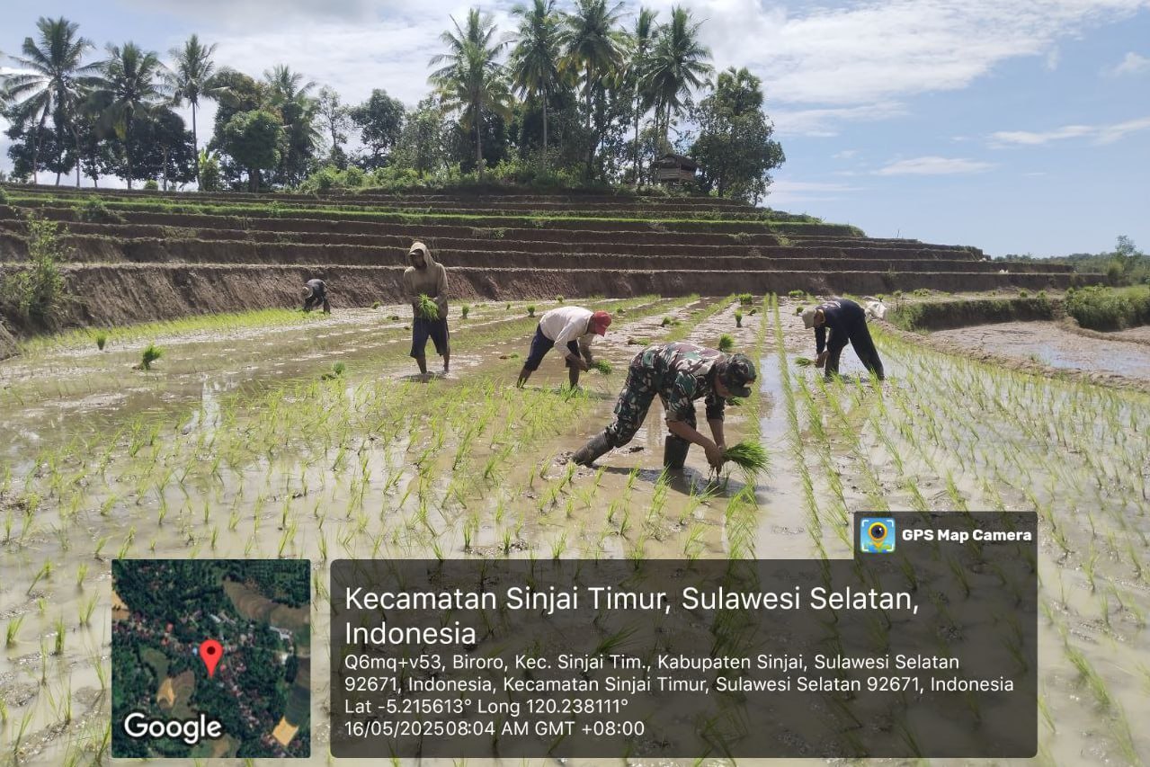 Sinjai – Dalam upaya mendukung program ketahanan pangan nasional, Babinsa Desa Patallassang Koramil 1424-04/Sinjai Timur, Sertu Mursalim, melaksanakan kegiatan pemantauan dan pendampingan penanaman padi di Dusun Boro’pao, Desa Patallassang, Kecamatan Sinjai Timur. Kegiatan ini berlangsung di area persawahan milik Kelompok Tani Batu Lappa dengan menggunakan sistem tanam pindah, Jumat (16/05/2025)