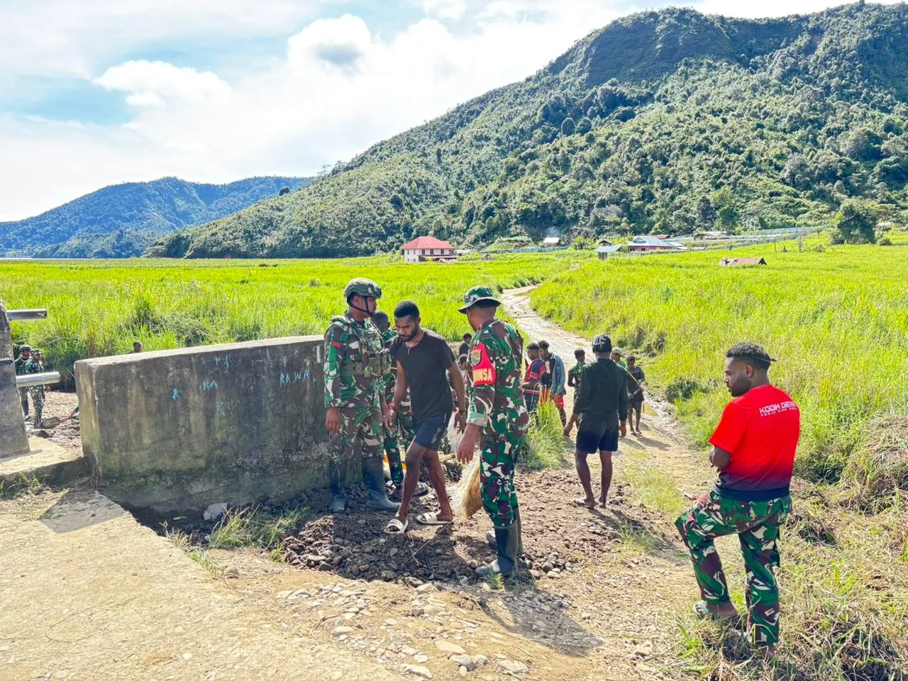 Obano – Di pimpin Danramil 1703-03/Obano kapten Inf Soleman Demotokay, bersama anggota babinsa beserta 10 orang anggota Satgas Pamtas Yonif 711/Rks dan warga bergotong royong melaksanakan penimbunan Jalan Kampung Obano, Distrik Paniai Barat, Kabupaten Paniai, Prov. Papua Tengah. Selasa,(09/12/2025).