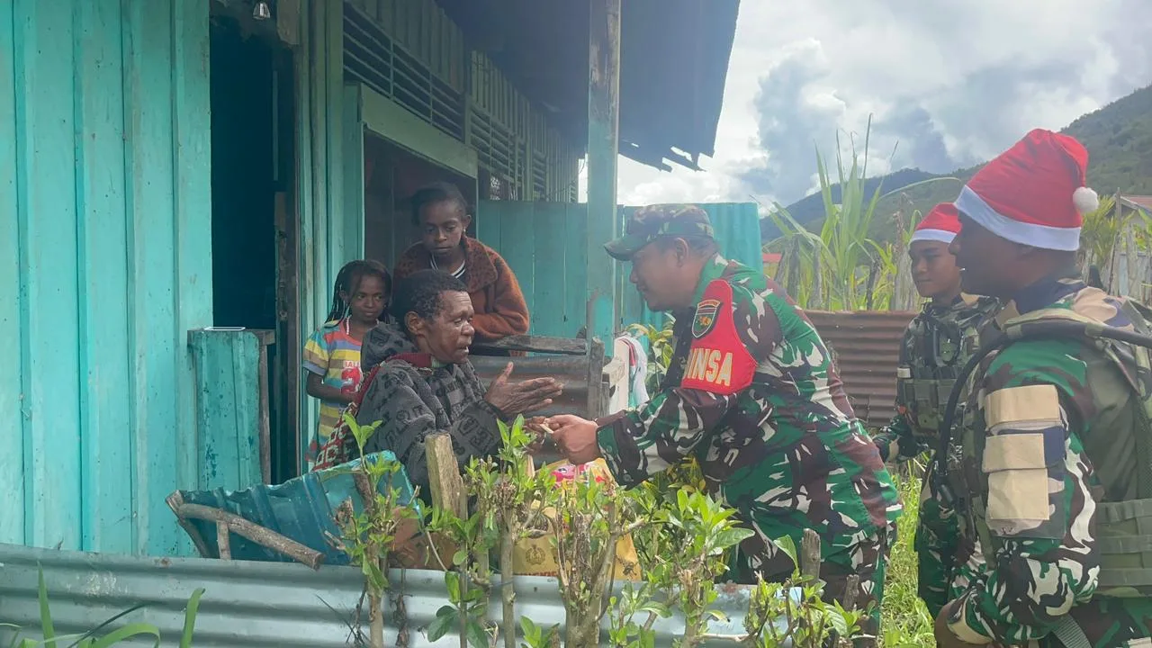 Obano – Babinsa Koramil 1703-03/Obano Serda Nazarudin Tambunan, bersama 3 orang rekan babinsa dan 10 orang Anggota Satgas Pamtas Yonif 711/Rks, melaksanakan kegiatan pembagian bingkisan natal berupa sembako kepada warga masyarakat di wilayah kampung binaan. Bertempat di Kampung Obano, Distrik Paniai Barat, Kabupaten Paniai, Prov. Papua Tengah. Selasa,(23/12/2025).