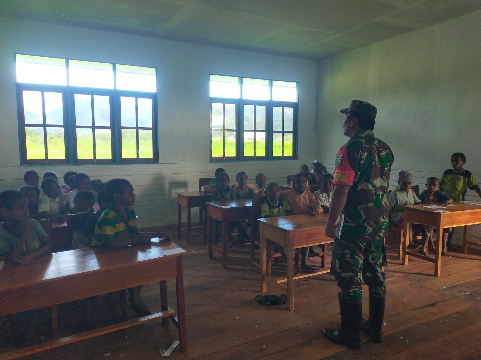 Obano – Untuk menumbuhkan jiwa patriotisme terhadap generasi muda penerus bangsa, Bintara Pembina Desa (Babinsa) Koramil 1703-03/Obano Serda Boy Manik, memberikan Wawasan Kebangsaan (Wasbang) kepada siswa-siswi SD Inpres Obano. Kampung Obano, Distrik Paniai Barat, Kabupaten Paniai, Prov. Papua Tengah. Selasa,(22/07/2025).