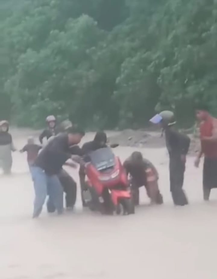 saat ini air meluap menggenangi badan jalan sehingga tidak bs dilalui oleh pengendara maupun pejalan kaki.