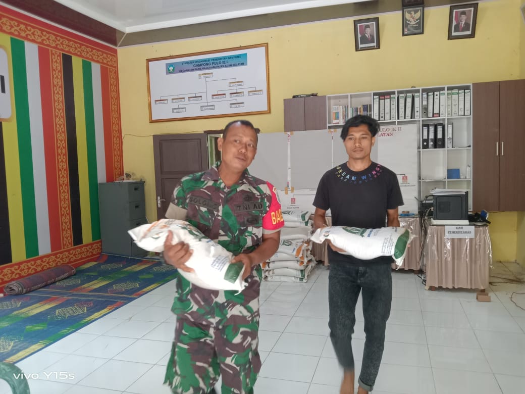 ACEH SELATAN – Babinsa Koramil 04/Pasi Raja, Kodim 0107/Aceh Selatan Serda Sulomo, melaksanakan pendampingan pada kegiatan penyaluran bantuan pangan berupa beras dari pemerintah kepada masyarakat Desa Ujung Padang Asahan Kecamatan Pasi Raja, Senin (18/8/2025).
