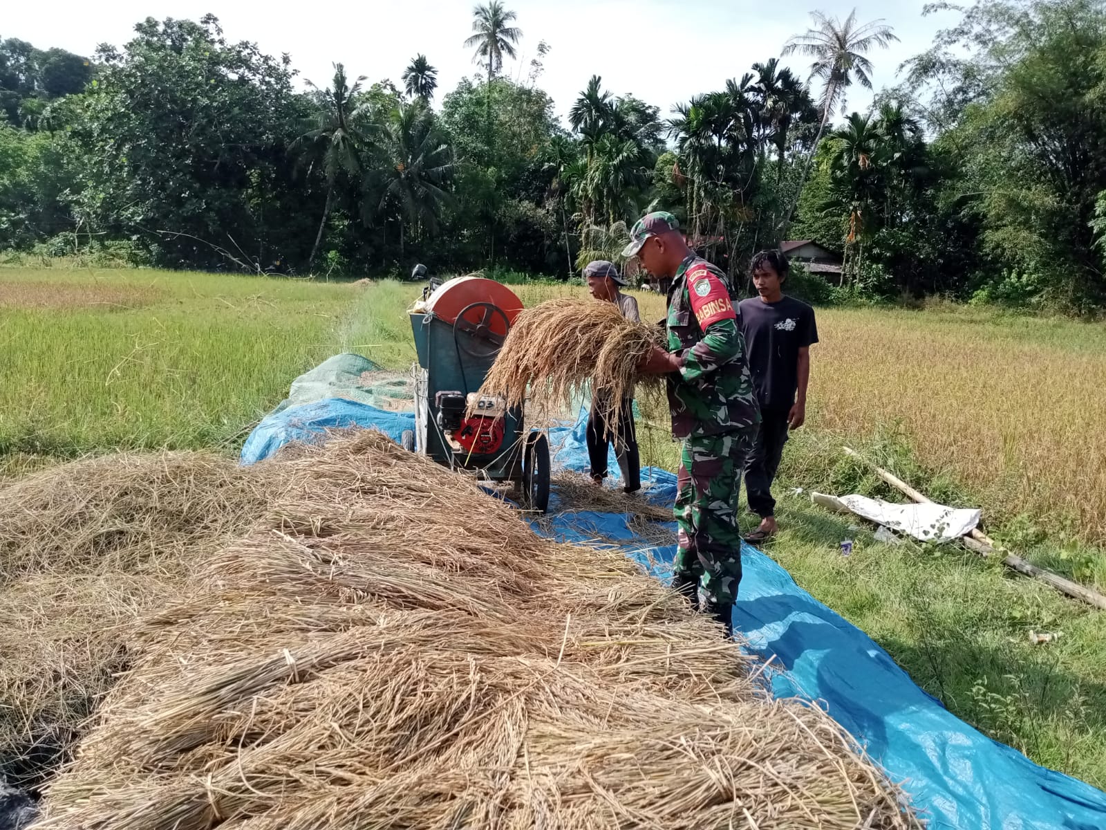 Simeulue – Babinsa Posramil Teupah Barat Koptu Ahmat Rison Melaksanakan Monitoring wilayah membantu petani merontokan padi yang sudah di panen menggunakan mesin prontok padi di lahan persawahan Edi Sumarlan warga Desa Salut Latun, Kecamatan Teupah Barat, kabupaten Simeulue. Selasa (17/06/2025).