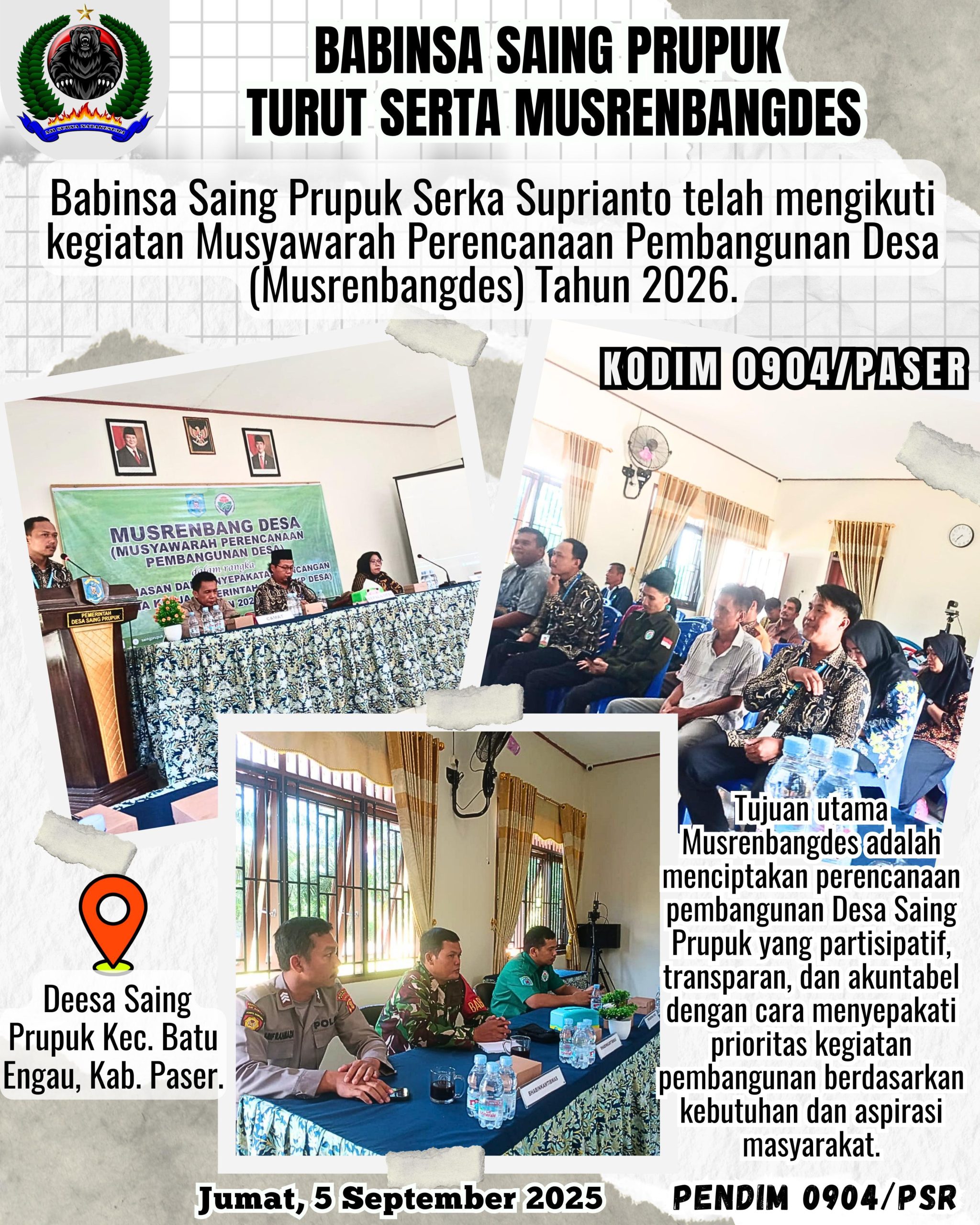 Kodim 0904/Psr, Korem 091/ASN, Kodam VI/Mlw – Bertempat di Gedung Sekretariat Desa Saing Prupuk, Babinsa Saing Prupuk Serka Suprianto telah mengikuti kegiatan Musyawarah Perencanaan Pembangunan Desa (Musrenbangdes) Tahun 2026.