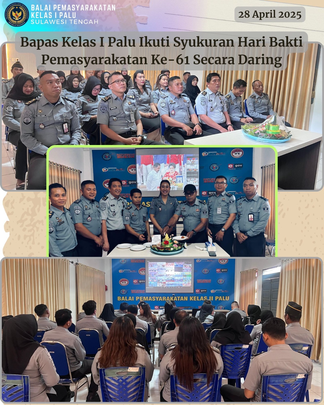 PALU – Balai Pemasyarakatan (Bapas) Kelas I Palu turut serta memeriahkan peringatan Hari Bakti Pemasyarakatan (HBP) ke-61 dengan menggelar kegiatan tasyakuran pada Senin, 28 April 2025. Acara yang diikuti oleh seluruh pegawai Bapas Kelas I Palu ini dilaksanakan di aula kantor melalui media Zoom, mengikuti jalannya acara puncak yang diselenggarakan secara terpusat oleh Direktorat Jenderal Pemasyarakatan Kementerian Imigrasi dan Pemasyarakatan RI.