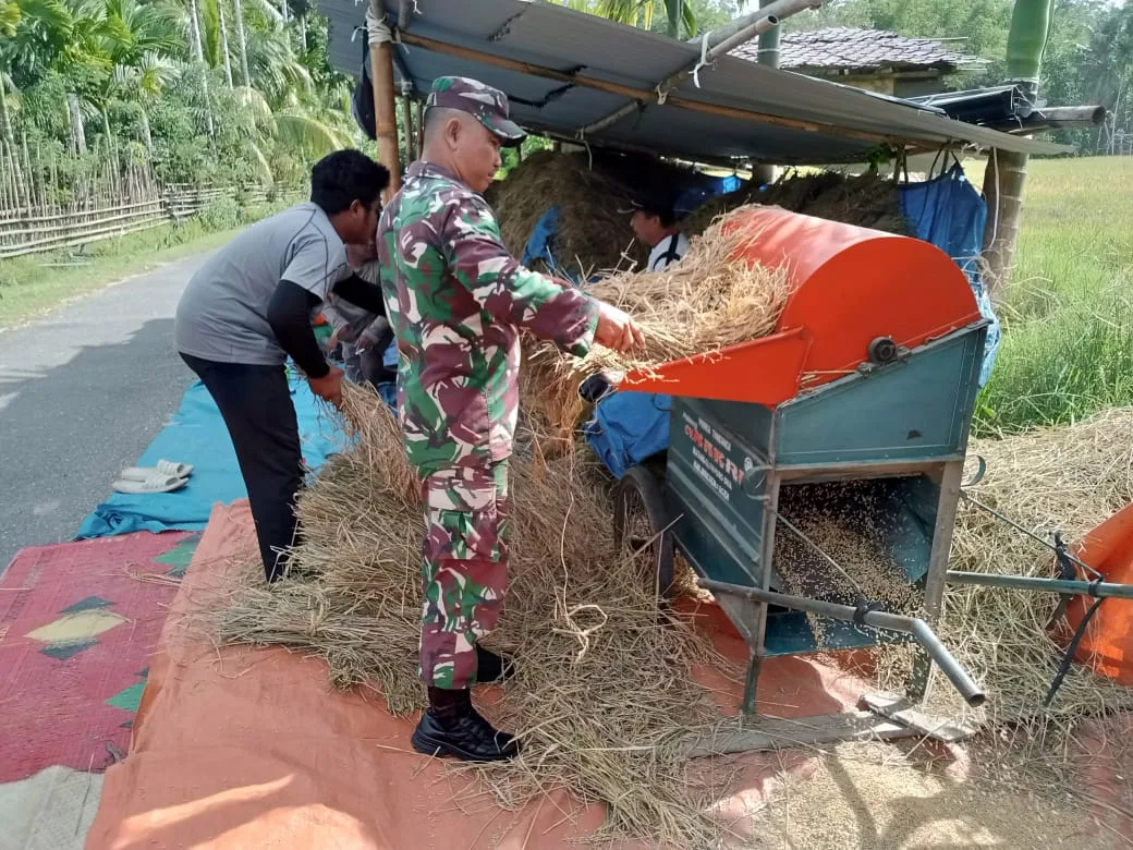 Usai mengarit padi bersama dengan warga di desa binaannya, Babinsa juga turut bantu petani lakukan perontokan padi dengan menggunakan mesin perontok padi di sawah milik warga desa binaan.