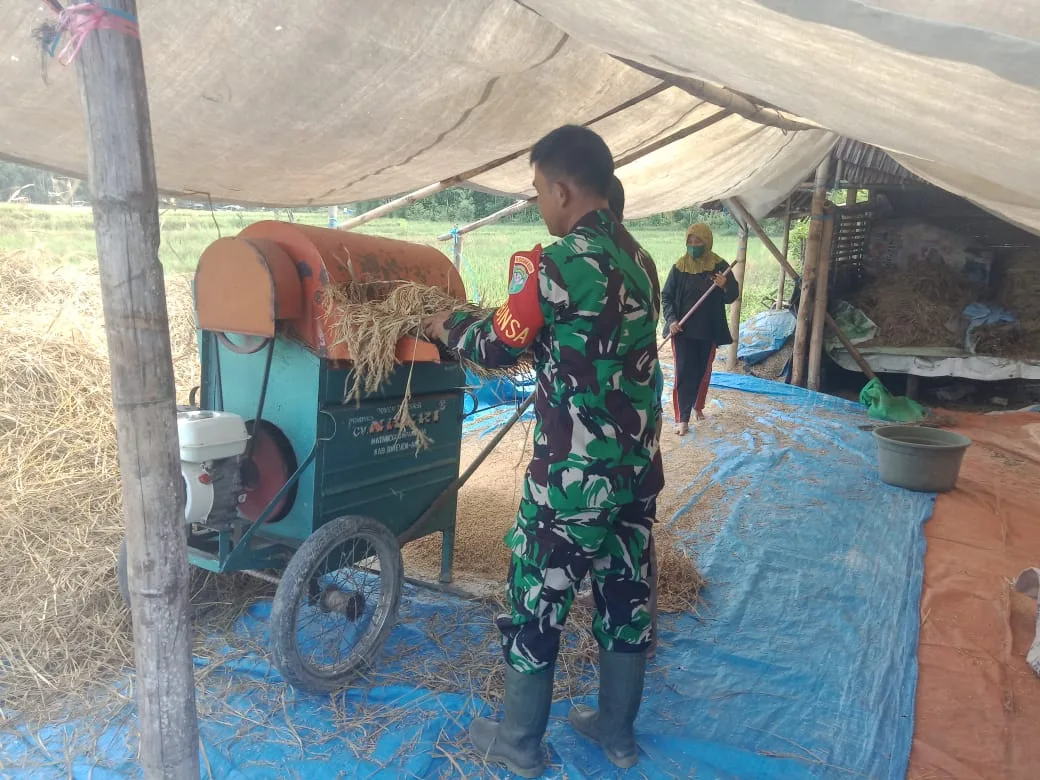 Usai mengarit padi bersama dengan warga di desa binaannya, Babinsa juga turut bantu petani lakukan perontokan padi dengan menggunakan mesin perontok padi di sawah milik warga desa binaan.