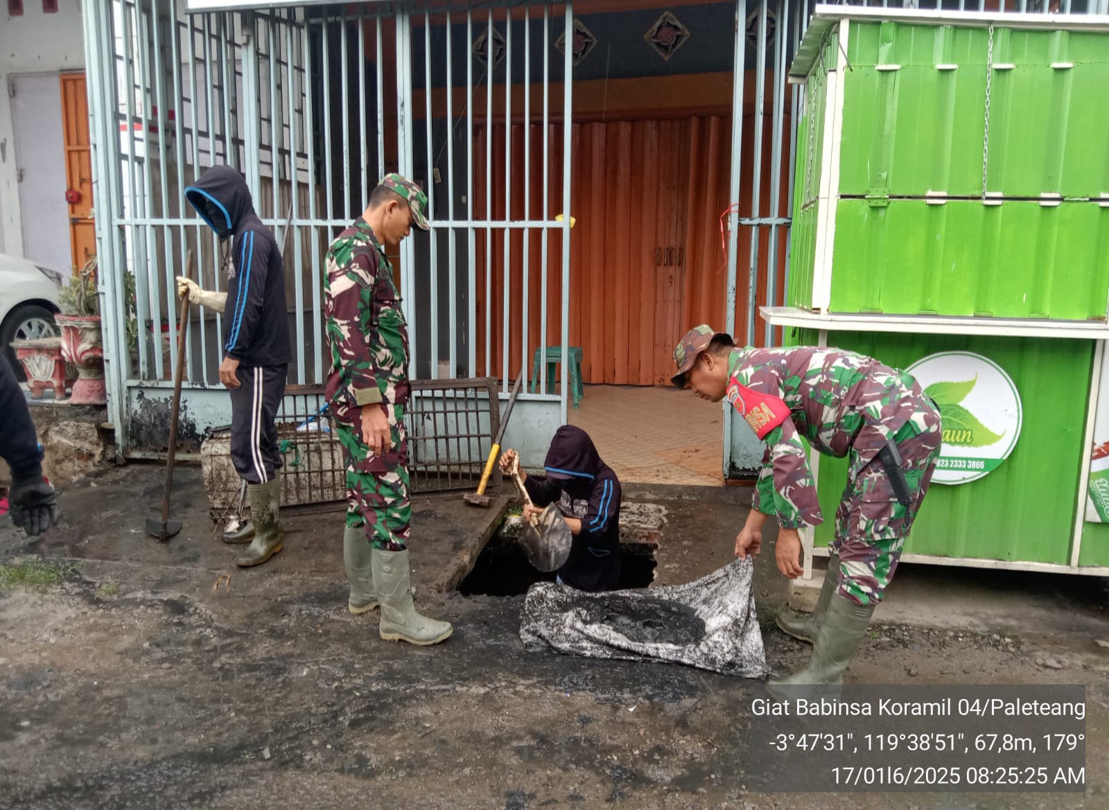 Kerja bakti dipimpin langsung oleh Danramil-04/Paleteang Kapten Cba Ridwan dengan melibatkan Staf Kelurahan, Dinas PURR dan warga setempat dengan sasaran pembersihan saluran air yang tersumbat sampah-sampah rumah tangga dan pasir.