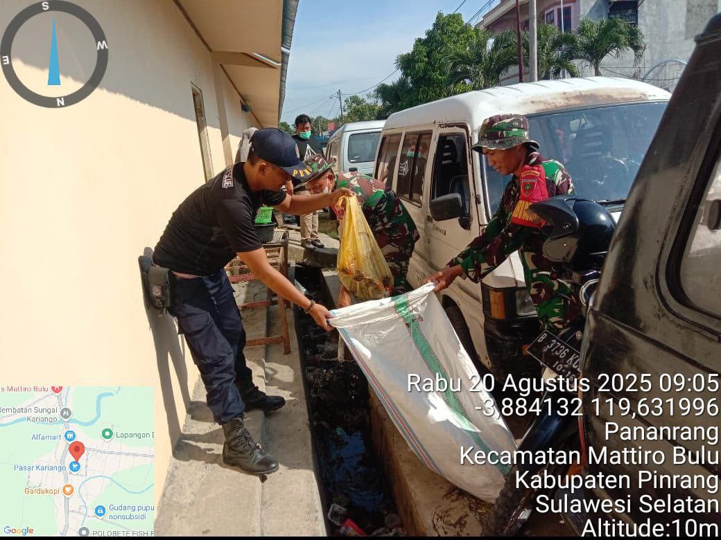Pinrang_ Untuk mengantisipasi banjir ketika hujan turun serta menjaga kebersihan Lingkungan, Babinsa jajaran Koramil-03/Mattiro Bulu Kodim 1404/Pinrang bersama warga melaksanakan kerja bakti pembersihan parit/saluran air di Dusun Kariango Desa Pananrang Kecamatan Mattiro Bulu Kabupaten Pinrang, Rabu (20/08/2025).