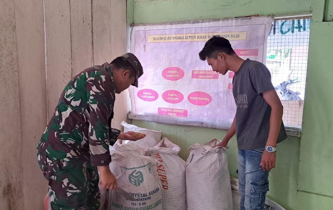 Simeulue – Babinsa Sertu Akmalul Rizki Koramil 01/Simtim, Kodim 0115/Simeulue, Korem 012/Teuku Umar. Melaksanakan Kegiatan Hanpangan mengecek kualitas gabah yang ingin di jual ke pihak bulog di Desa Suak Buluh, Kecamatan Simeulue Timur, Kabupaten Simeulue. Sabtu (26/07/2025).