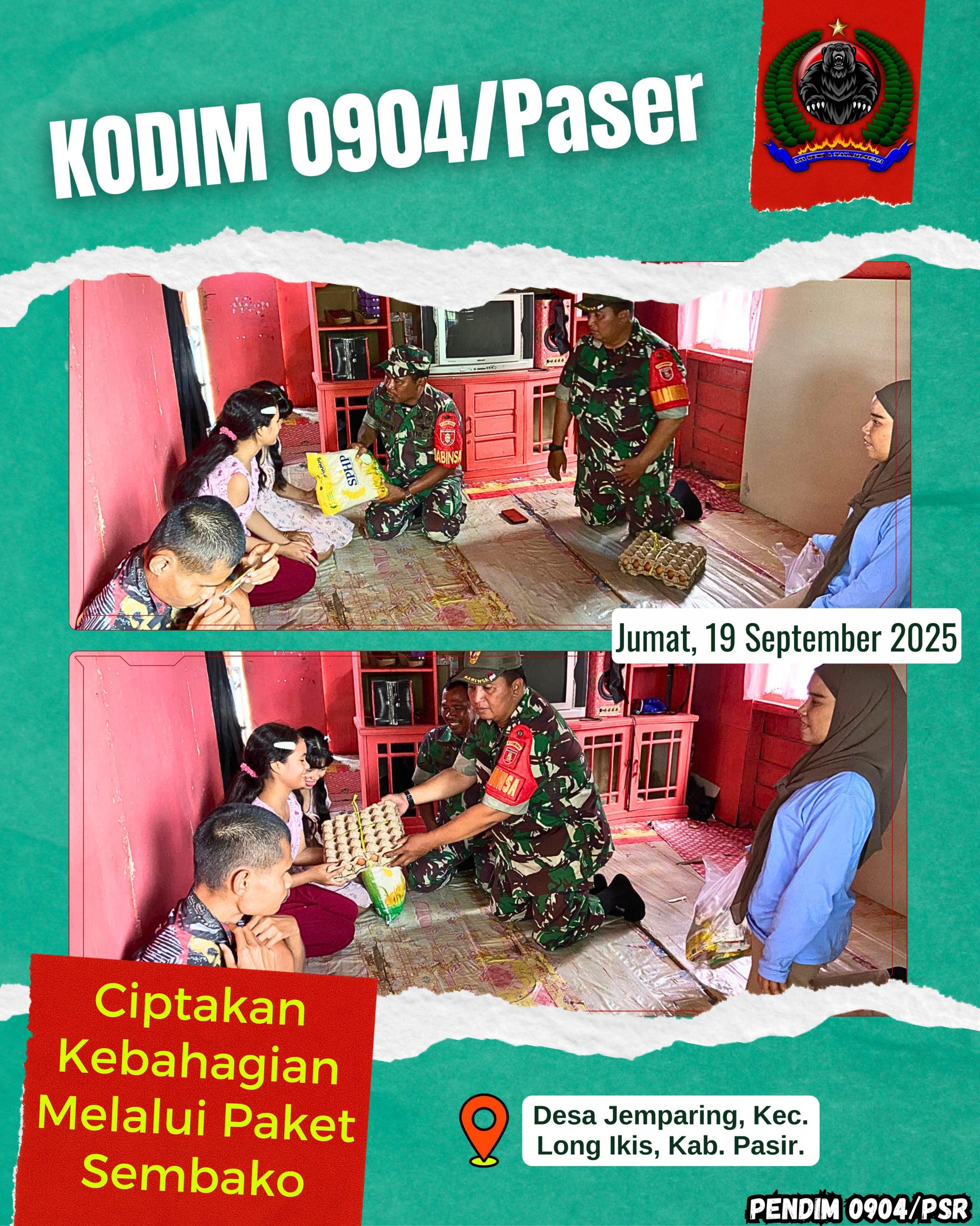 Kodim 0904/Psr, Korem 091/ASN, Kodam VI/Mlw – Anggota Koramil 0904-04/Long Ikis Sertu Rohani dan Serka Joko, Staf Desa dan Ketua RT. 5 memberikan bantuan sembako kepada salah satu warga yang membutuhkan dan memiliki anak disabilitas di Desa Jemparing, Kec. Long Ikis, Kab. Pasir, Jumat (19/9/2025).