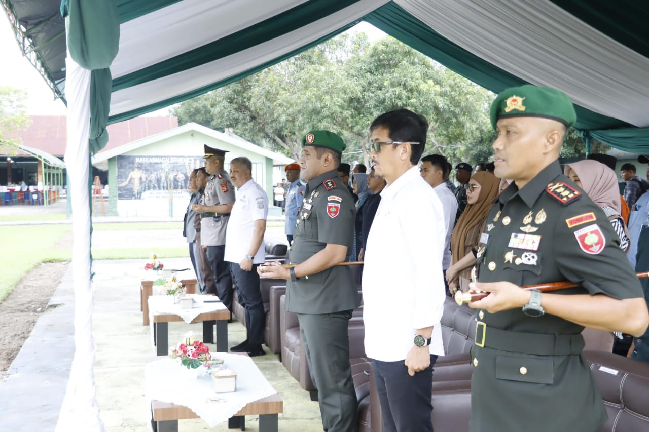 Pinrang_ Dandim 1404/Pinrang Letkol Inf Abdullah Mahua, S.H.I., M.M., bersama Forkopimda Pinrang menghadiri upacara serah terima jabatan dan tradisi Korps Komandan Batalyon Infanteri 721/Mks dari Letkol Inf Satrio Budi Bowo Leksono, S.I.P., kepada Letkol Inf Farid Heru Puriyanto, S.H., yang dilaksanakan di lapangan upacara Mako Yonif 721/Mks Kabupaten Pinrang, Rabu (02/07/2025).