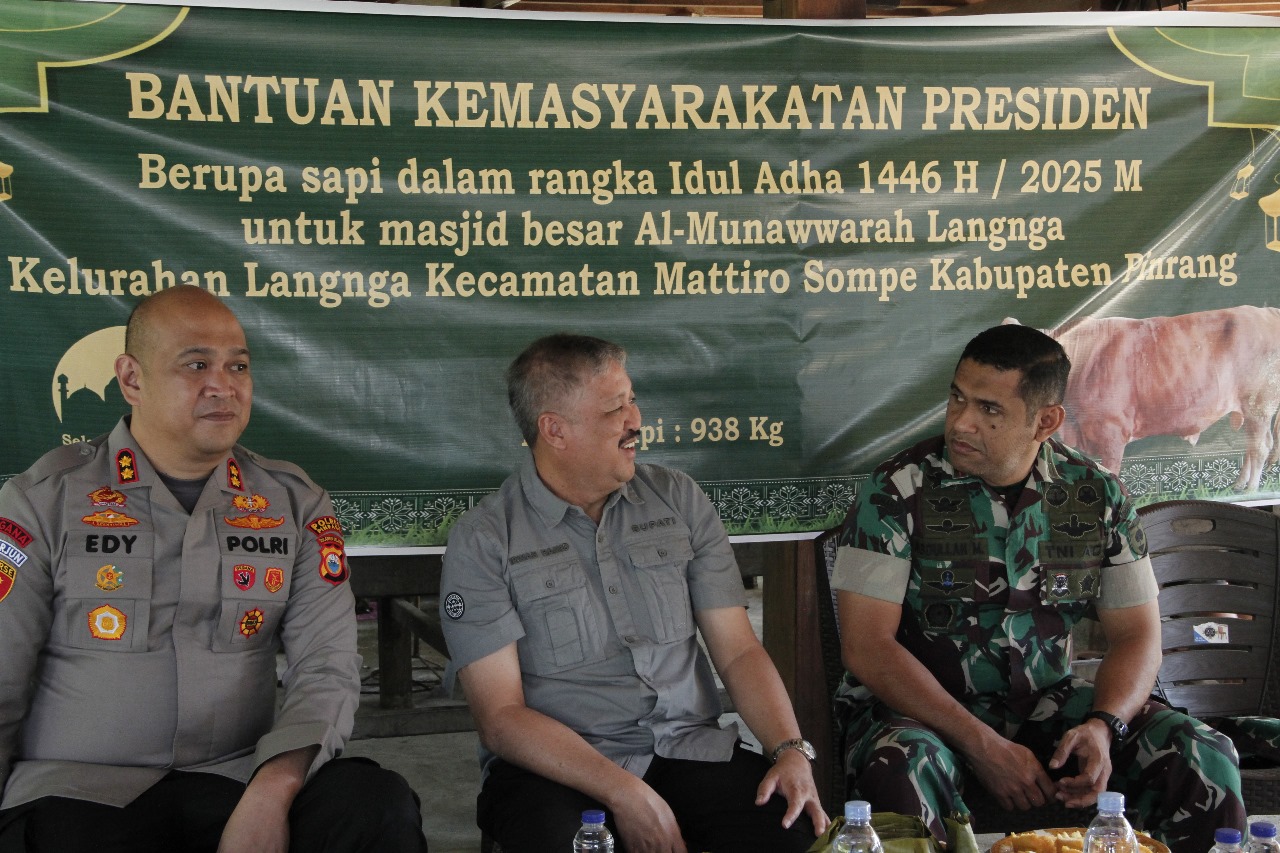 Pinrang_ Dandim 1404/Pinrang Letkol Inf Abdullah Mahua, S.H.I., M.M., bersama Bupati Pinrang H. Andi Irwan Hamid S. Sos dan Forkopimda Pinrang menyerahkan sapi kurban jenis Brahman Cross dengan bobot 938 Kg bantuan Presiden Republik Indonesia Prabowo Subianto kepada panitia kurban Masjid Besar Al-Munawarrah di Kelurahan Langnga Kecamatan Mattiro Sompe Kabupaten Pinrang, Sabtu (07/06/2025).