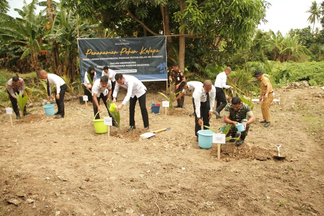 Pinrang_ Dandim 1404/Pinrang Letkol Inf Abdullah Mahua, S.H.I., M.M., bersama Forkopimda melaksanakan penanaman pohon kelapa di Rutan kelas IIB Kelurahan Manarang Kecamatan Mattiro Bulu Kabupaten Pinrang, Rabu (10/09/2025).