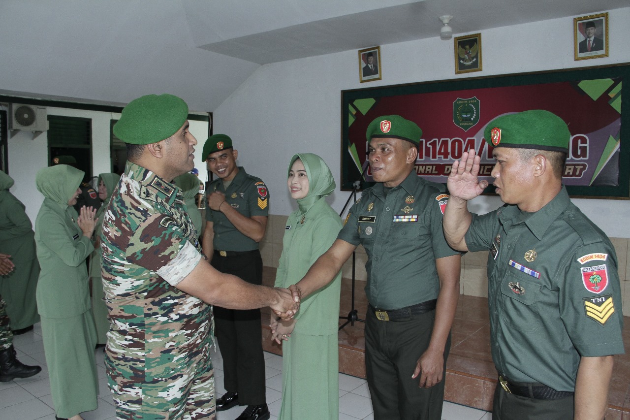 Pinrang_ Dandim 1404/Pinrang Letkol Inf Abdullah Mahua, S.H.I., M.M., memimpin acara Korp Raport 14 orang personel Kodim 1404/Pinrang yang menerima kenaikan pangkat reguler satu tingkat lebih tinggi dari pangkat semula di Pendopo Makodim 1404/Pinrang, Sabtu (26/04/2025).