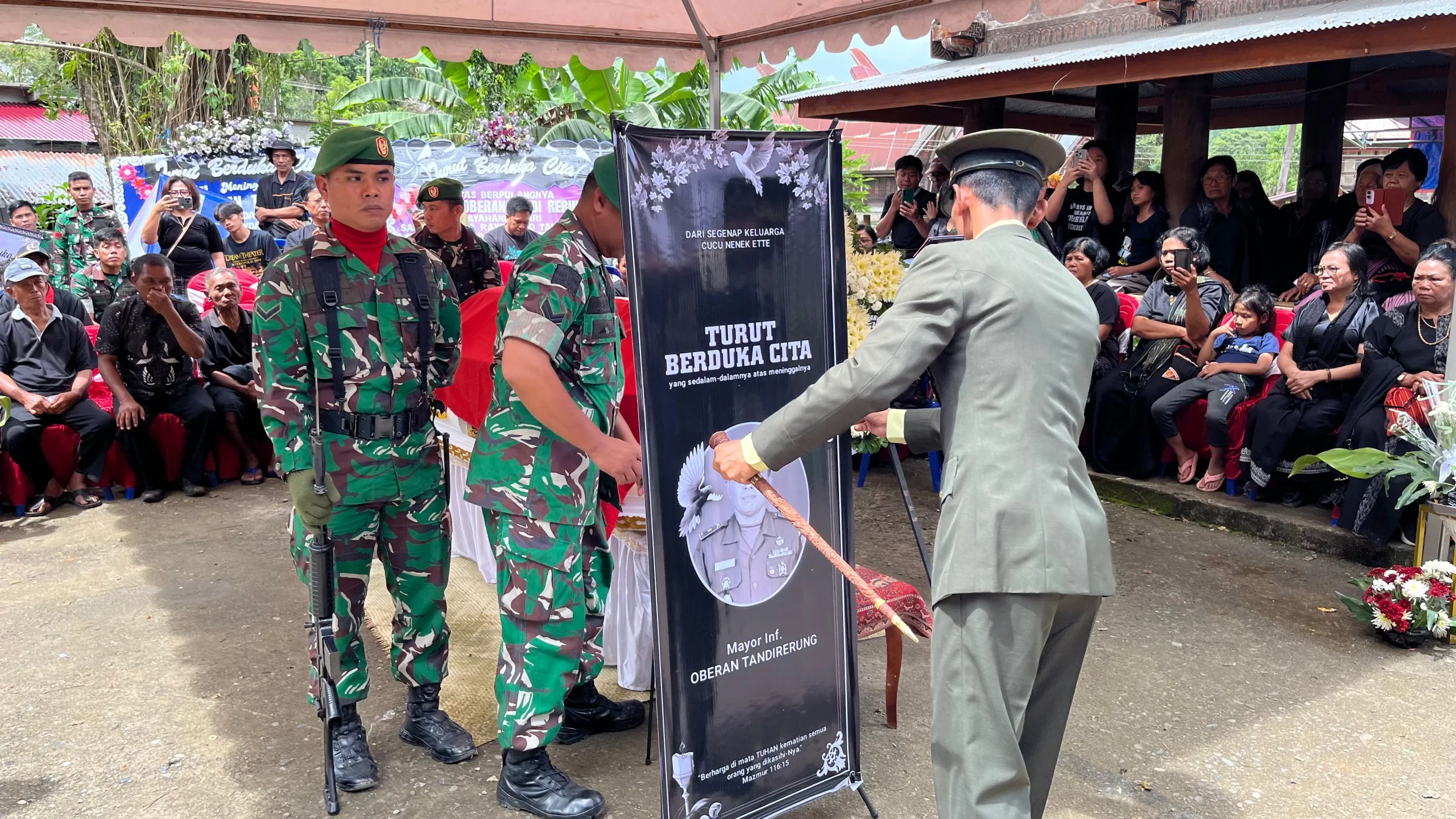 “Pada hari ini kita berkumpul untuk memberikan penghormatan terakhir kepada Almarhum Mayor Inf Oberan Tandirerung. Upacara ini merupakan bentuk penghargaan negara atas dedikasi dan pengabdian beliau selama menjalankan tugas, termasuk dalam pelaksanaan operasi demi menjaga keutuhan Negara Kesatuan Republik Indonesia,” ungkapnya.