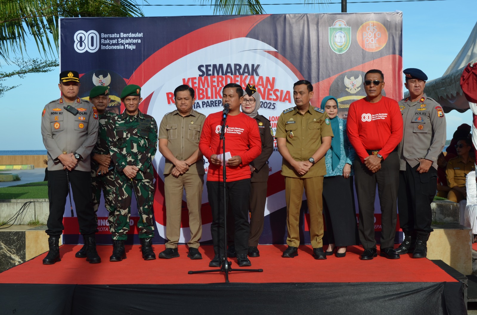 Kami turut berpartisipasi melepas peserta lomba gerak jalan tingkat pelajar SD se-Kota Parepare dalam rangka peringatan Ulang Tahun ke-80 Republik Indonesia. Ungkap Dandim 1405/Parepare Letkol Kav S.Simanjuntak, S.I.P