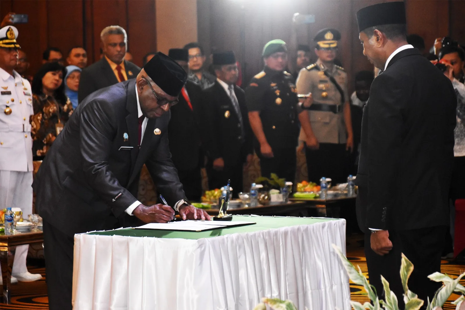 Komandan Kodim 1707/Merauke Letkol Czi Dili Eko Setyawan, S.Ak., M.Han., didampingi Ketua Persit KCK Cabang XVIII Kodim 1707/Merauke Ny. Asti Dili Eko Setyawan menghadiri Acara Pelantikan, Pengambilan Sumpah/Janji, dan Serah Terima Jabatan Pimpinan Tinggi Madya Sekretaris Daerah Provinsi Papua Selatan, yang dipimpin langsung oleh Gubernur Provinsi Papua Selatan Prof. Dr. Ir. Apolo Safanpo, ST., MT.