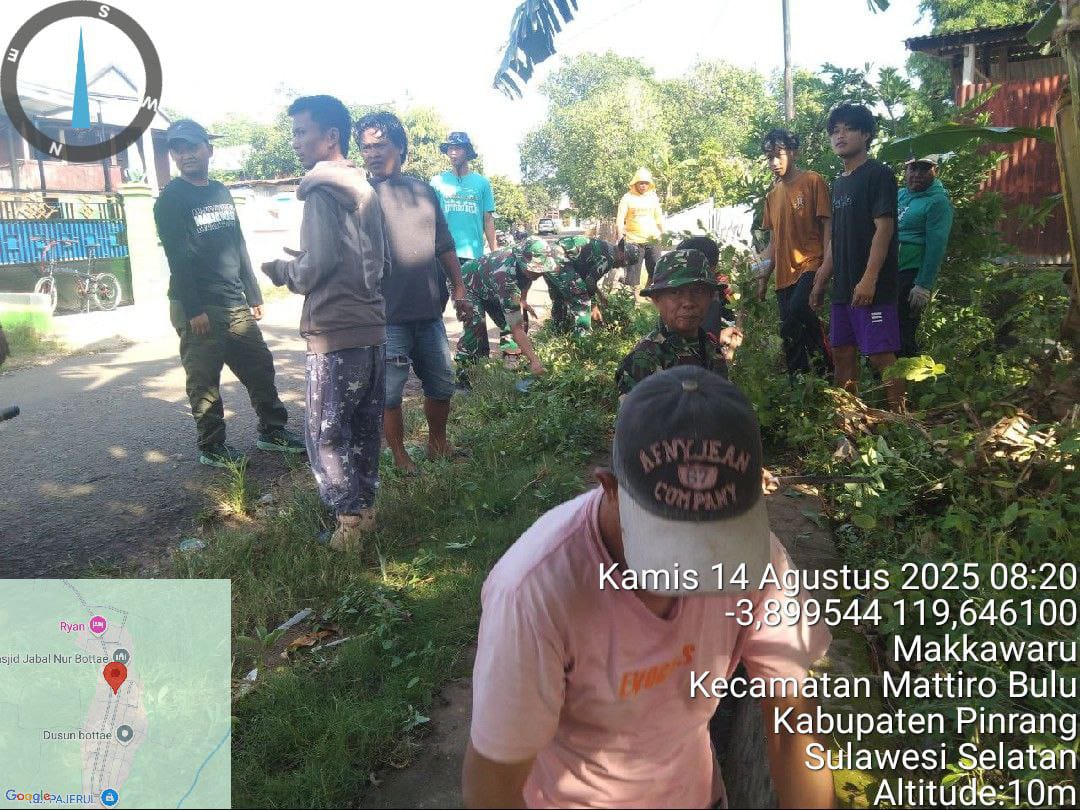 Pinrang_ Kegiatan pembersihan saluran air dalam rangka antisipasi banjir saat hujan dan timbulnya wabah penyakit semakin diintensifkan. Kali ini Danramil-03/Mattiro Bulu Kodim 1404/Pinrang Kapten Cba Najamuddin memimpin langsung kerja bakti bersama masyarakat dengan sasaran pembersihan saluran air di Dusun Bottae Desa Makkawaru Kecamatan Mattiro Bulu Kabupaten Pinrang, Kamis (14/08/2025).