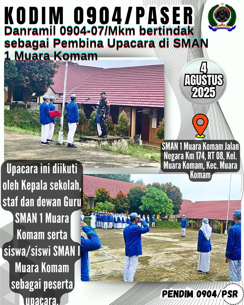 Kodim 0904/Psr, Korem 091/ASN, Kodam VI/Mlw – Pada hari Senin 4 Agustus 2025 Pukul 08.00 Wita telah dilaksanakan Upacara Bendera di SMAN 1 Muara Komam Jalan Negara Km 174, RT 08, Kel. Muara Komam, Kec. Muara Komam, Kab. Paser, Senin (4/8/2025).