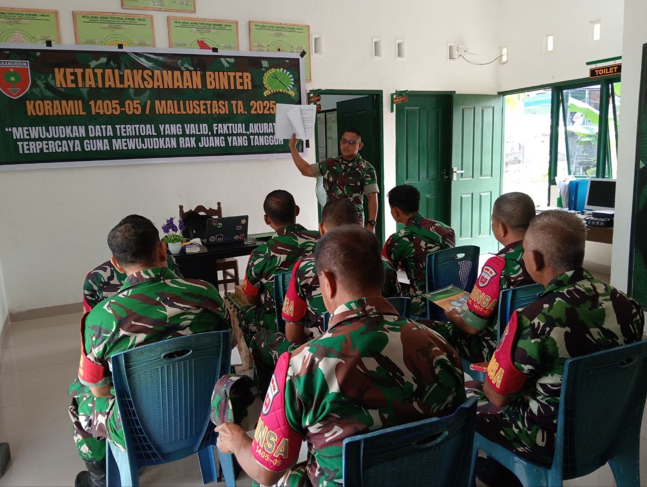 KODIM 1405/PAREPARE – Guna meningkatkan kemampuan para anggota dalam sinkronasi dan pemutakhiran data di wilayah teritorial, Komandan Koramil (Danramil) 1405-05/Mallusetasi Letda Inf Andi Pallawagau gelar ketatalaksanaan Pembinaan Teritorial (Binter) di Makoramil yang berlokasi di Kecamatan Mallusetasi, Kabupaten Barru. Rabu (25/06/2025)