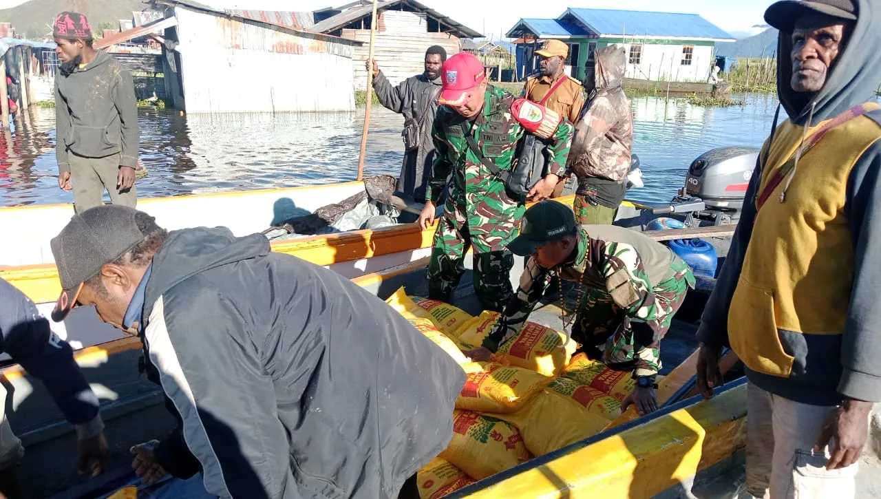 Paniai – Danramil 1703-01/Enarotali Kapten Inf Eko Warsito turut mendampingi Bupati Kabupaten Paniai, Yampit Nawipa, A.Md.Tek, dalam kegiatan penyaluran bantuan berupa beras kepada masyarakat yang terdampak banjir di Distrik Topiyai, Ekadide, dan Aradide Kabupaten Paniai, Provinsi Papua Tengah. Pada Senin (29/09/2025).