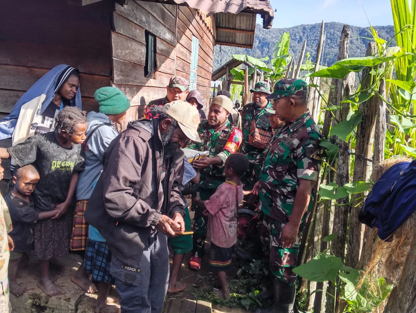 Obano – Komandan Koramil Kpt Inf S. Demotokay dan Babinsa 1703-03/Obano Melayat ke rumah Duka Kepala Kampung Epo Obano Hosea Pigai , di Kampung Epo Obano Distrik Paniai Barat, Kabupaten Paniai, Prov. Papua Tengah. Kamis,(26/02/2026).