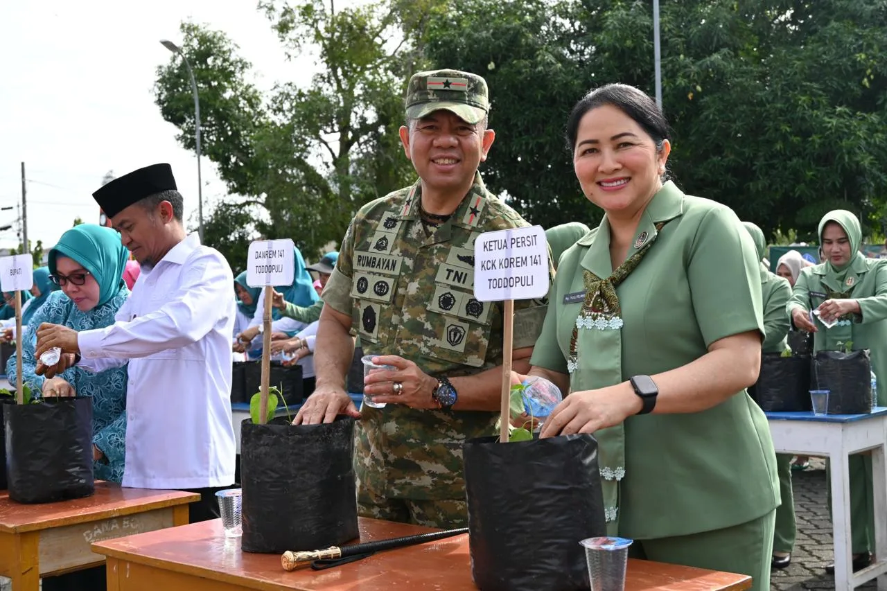 Bone — Danrem 141/Toddopuli Brigjen TNI Andre Clift Rumbayan, S.Sos., M.M. didampingi Ketua Persit Kartika Chandra Kirana Koorcab Rem 141 PD XIV/Hasanuddin Ny. Yuli Rumbayan, menghadiri kegiatan Gerakan Tanam Cabai Serentak Kabupaten Bone Tahun 2025 yang berlangsung di Halaman Rumah Jabatan Bupati Bone, Jl. Petta Ponggawae, Watampone, Rabu (10/12/2025)