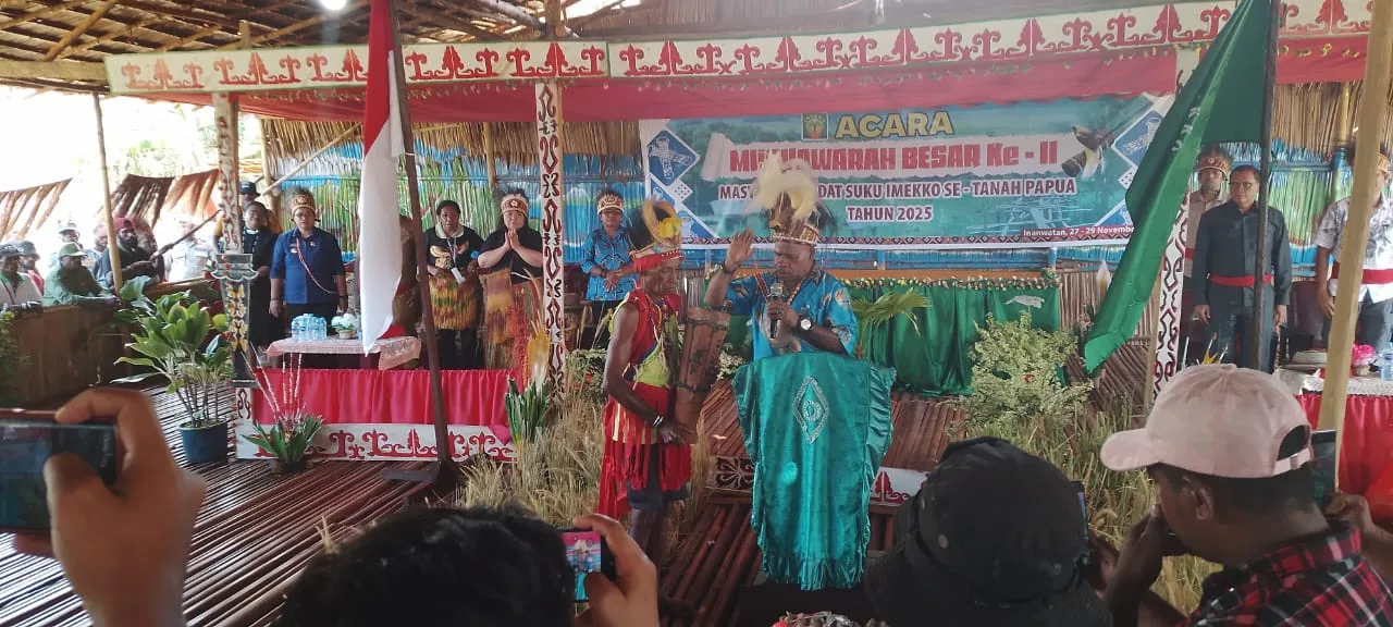 Acara Musyawarah Besar Ke-ll Masyarakat Adat Suku IMEKKO Se-Tanah Papua Tahun 2025 dihadiri oleh Pejabat TNI-Polri, OPD Prov. Papua Barat Daya, Kepala Daerah, Ketua TP PKK Ny. Orpa Susan Kambu, Pimpinan OPD Kab. Sorong Selatan dan Kab. Maybrat, Wakil Ketua I MRP Prov. PBD Susance Saflesa, Wakil II DPR Prov. PBD Lieke Makaatuk, Ketua forum lintas Suku Asli Papua Bastian Buce Ijie dan Para Tokoh Imekko dan masyarakat IMEKKO. (Penrem 181/PVT)
