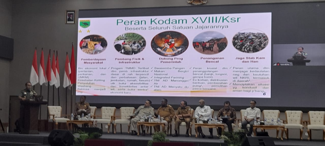 Dalam forum tersebut, Brigjen TNI Lumbantoruan selaku Kapoksahli Pangdam XVIII/Kasuari mewakili Pangdam XVIII/Kasuari, Mayjen TNI Jimmy Ramoz Manalu, S.Hub.Int., M.H.I., memaparkan secara komprehensif peran strategis Kodam XVIII/Kasuari dalam mendukung pembangunan daerah Papua Barat Daya.