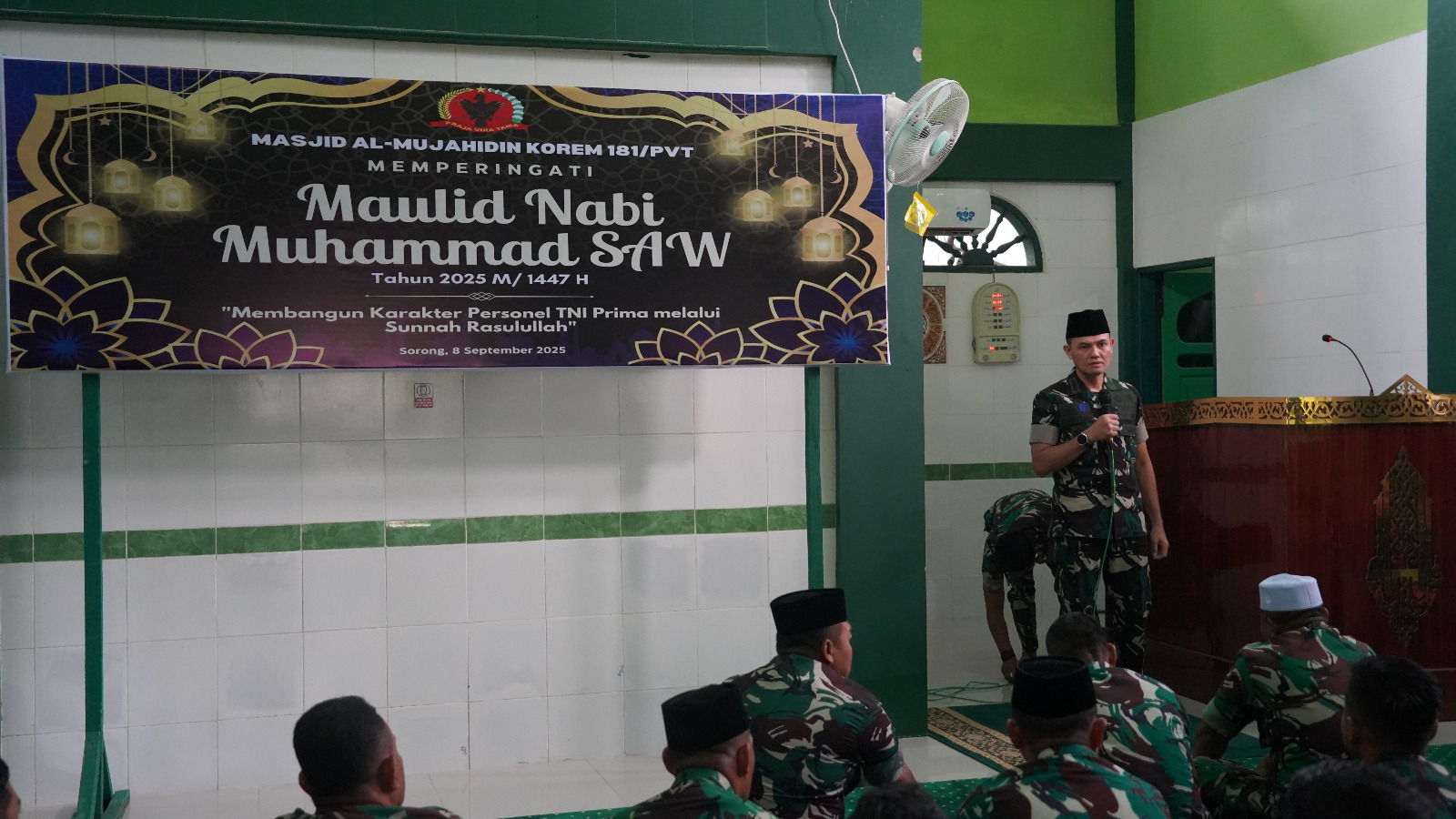 Dalam rangka memperingati Maulid Nabi Muhammad SAW 1447 H/2025 M, Komando Resor Militer (Korem) 181/Praja Vira Tama melaksanakan kegiatan keagamaan di Masjid Al Mujahidin Korem 181/PVT, Senin (8/9/2025).