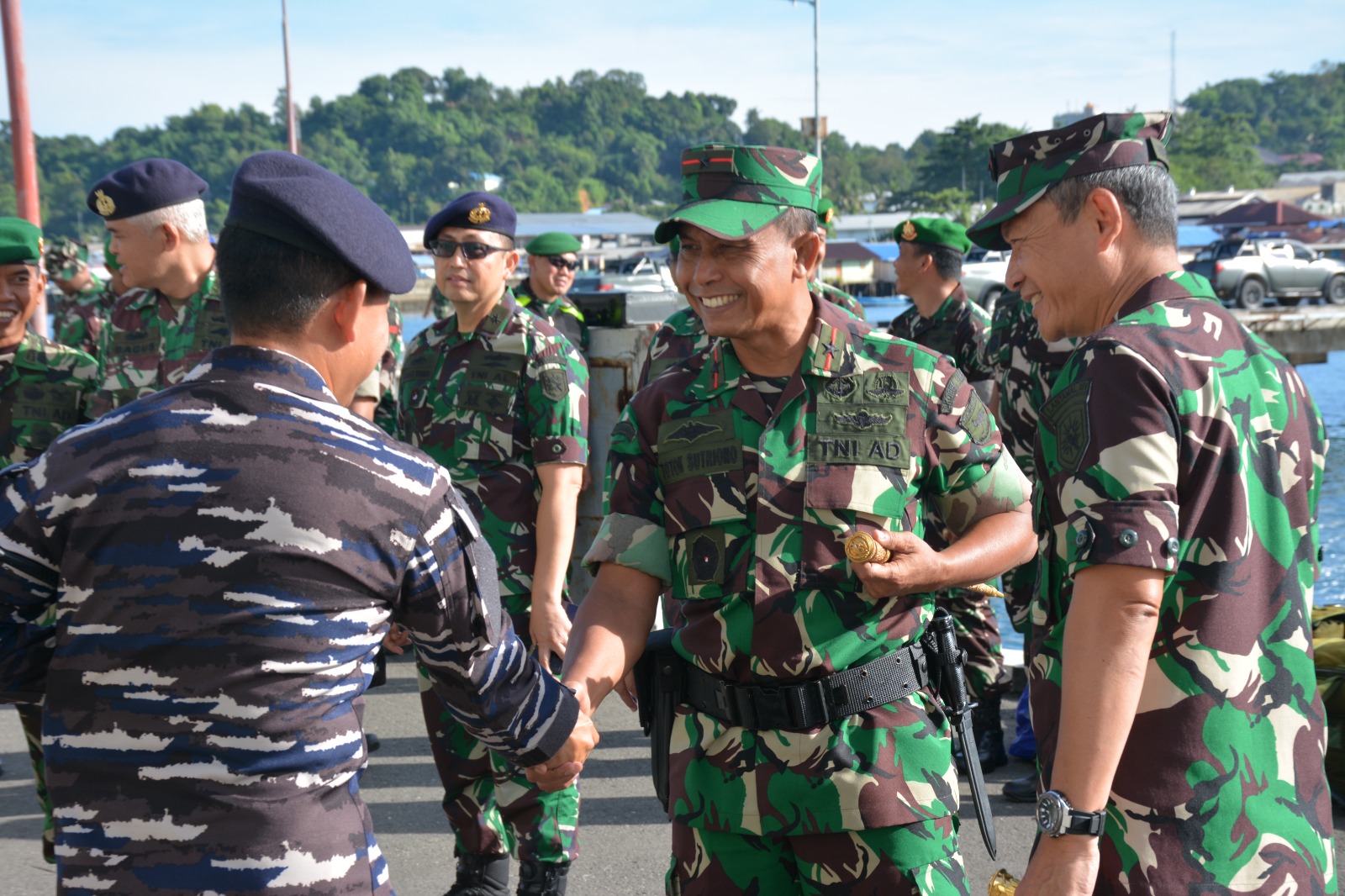 Sorong – Papua Barat Daya, Komandan Korem (Danrem) 181/Praja Vira Tama (PVT), Brigjen TNI Totok Sutriono, S.Sos., M.M., bersama Danlantamal XIV menyambut kedatangan Satuan Tugas Pengamanan Perbatasan (Satgas Pamtas) RI-Papua Nugini dari Yonif 763/SBA dan Yon Marinir 10 di Pelabuhan Lantamal XIV, Sorong, Jumat (23/5/2025).