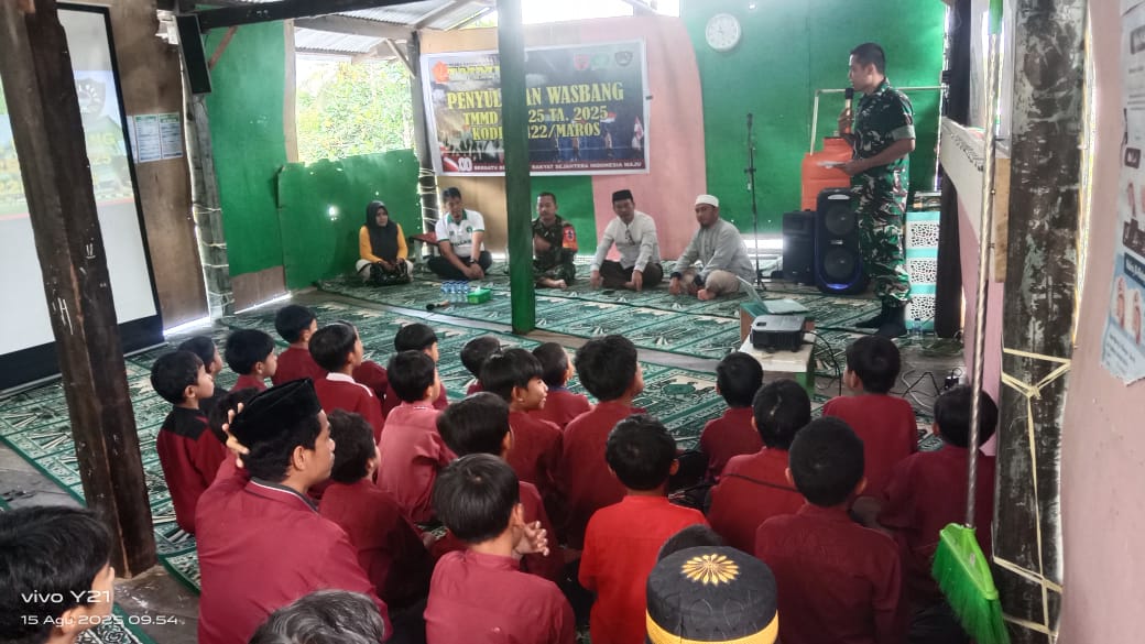 Maros – Komandan Kodim 1422/Maros Letkol Arm Agung Yuhono, S. E, selaku Dansatgas TMMD ke -125 memberikan Penyuluhan Wawasan Kebangsaan kepada adik-adik generasi muda khususnya para Siswa/siswi pondok pesantren, kegiatan ini sangatlah perlu adik-adik tau dan diingatkan serta ditanamkan kembali tentang wawasan kebangsaan sejak dini. Kegiatan di laksanakan di Pondok Pesantren Ukhuw,wah Islamiyyah MK-Uba Mapin Kelurahan Sabila Kecamatan Mallawa, Jum’at (15/8/2025).