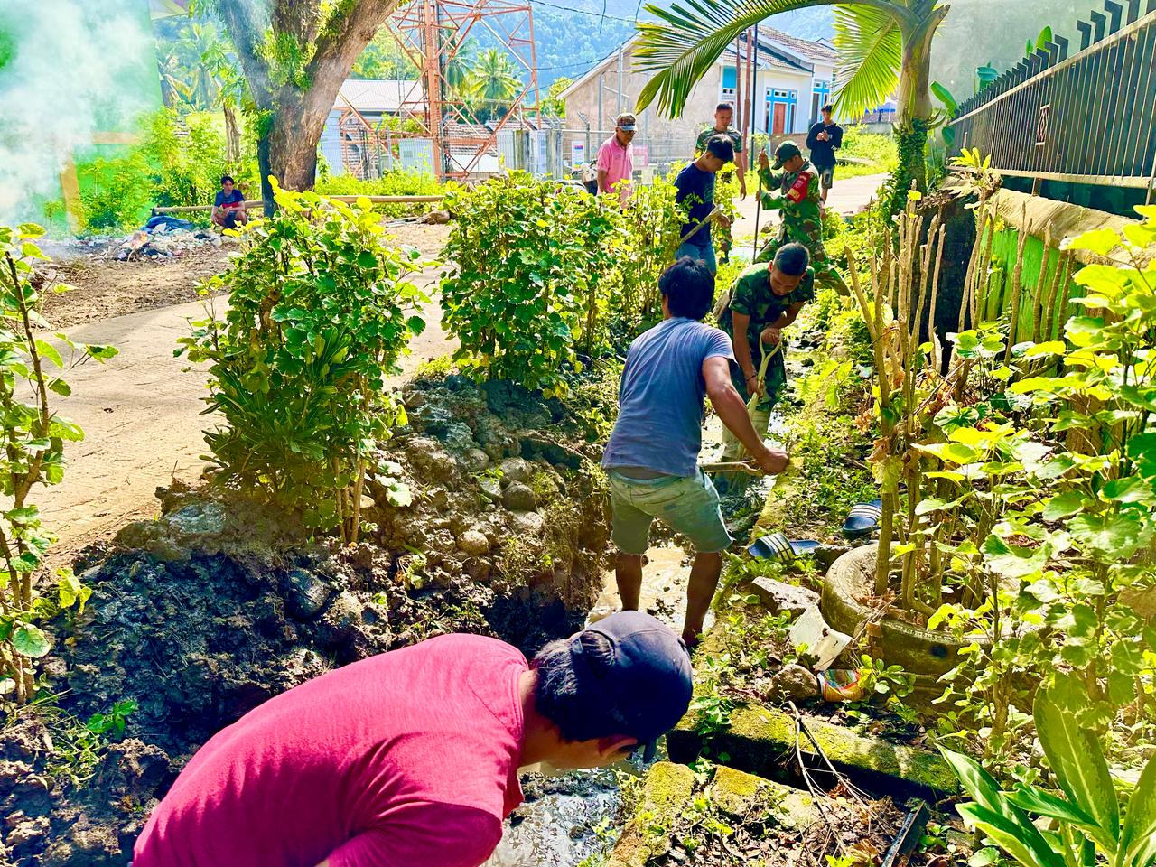 Tampak anggota Koramil bersama masyarakat bersemangat membersihkan sampah dan rumput-rumput liar di selokan, untuk kemudian dibuang ke tempat sampah yang tersedia.