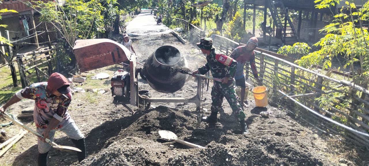 KODIM 1405/PAREPARE – Dengan semangat gotong-royong Babinsa Koramil 1405-06/Barru Serda Agus Jumeno bersama masyarakat bahu membahu melaksanakan kegiatan gotong royong pengecoran Jalan, bertempat di Dusun Tompo Desa Tompo Kecamatan Barru Kabupaten Barru. Jum’at (27/06/2025)