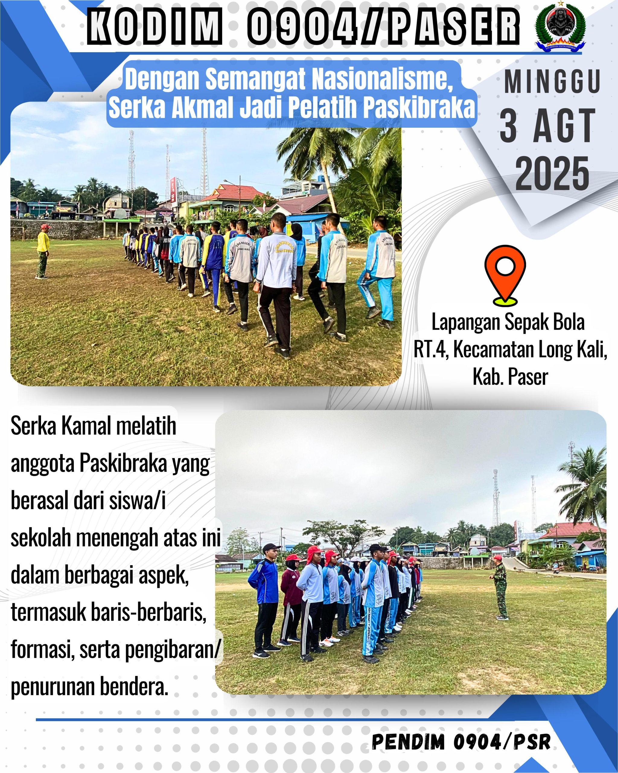 Kodim 0904/Psr, Korem 091/ASN, Kodam VI/Mlw – Personil Koramil 0904-03/Long Kali Serka Kamal Menjadi Pelatih Paskibraka Tingkat Kecamatan yang bertempat di Lapangan Sepak Bola RT.4, Kecamatan Long Kali, Kab. Paser, Minggu (03/3/2025).