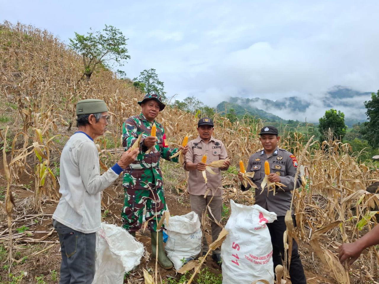 Pinrang_ Untuk mendukung ketahanan pangan dan meningkatkan kesejahteraan petani, 3 pilar Desa Batulappa yaitu Babinsa Koramil-05/Patampanua Kodim 1404/Pinrang Serma Muhammad Hatta, Bhabinkamtibmas Polsek Patampanua Brigpol Andy dan Kepala Desa Batulappa Abdul Taha membantu warga panen jagung, Senin (01/09/2025).