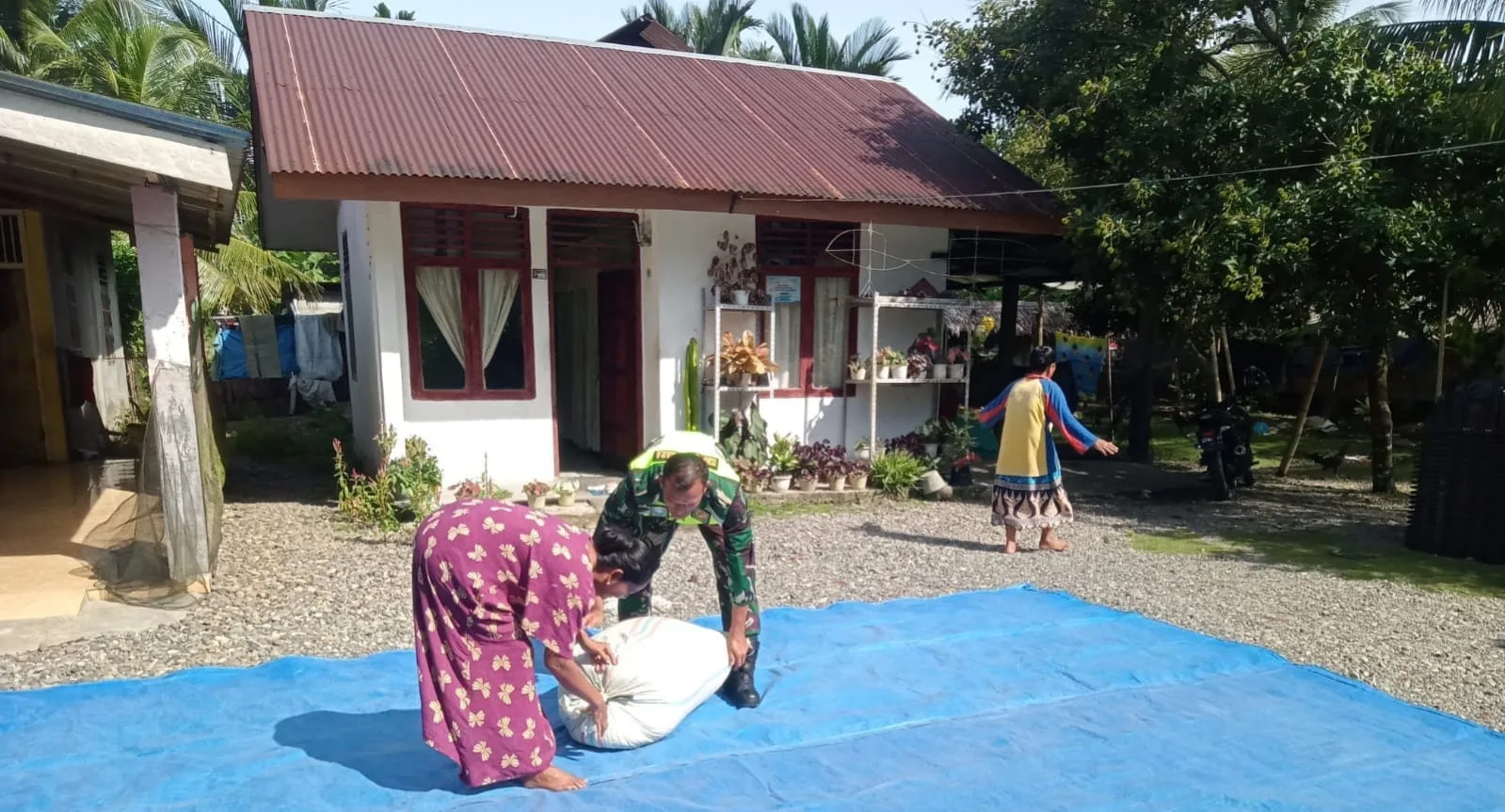 Nagan Raya* Babinsa Koramil 02/Seunagan Sertu Nasrullah Bantu warga menjemur padi didesa Binaan Desa Kulu Kec.Seunagan Kab.Nagan Raya Selasa (30/12/2025)