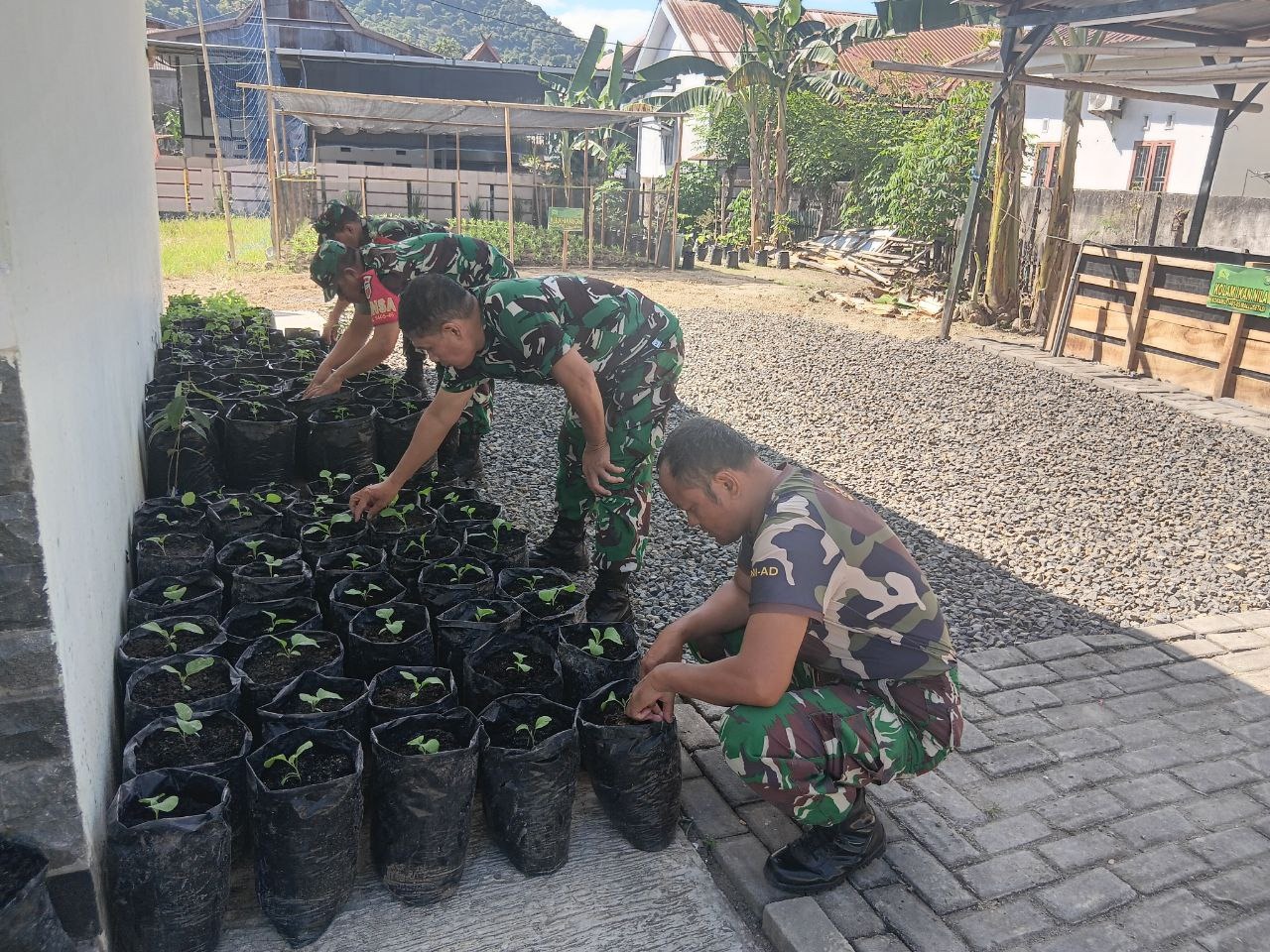 Sejumlah personel turun langsung dengan melakukan perawatan hingga mencabut rumput serta menyiram tanaman, yang memanfaatkan lahan terbatas di lingkungan Makoramil.