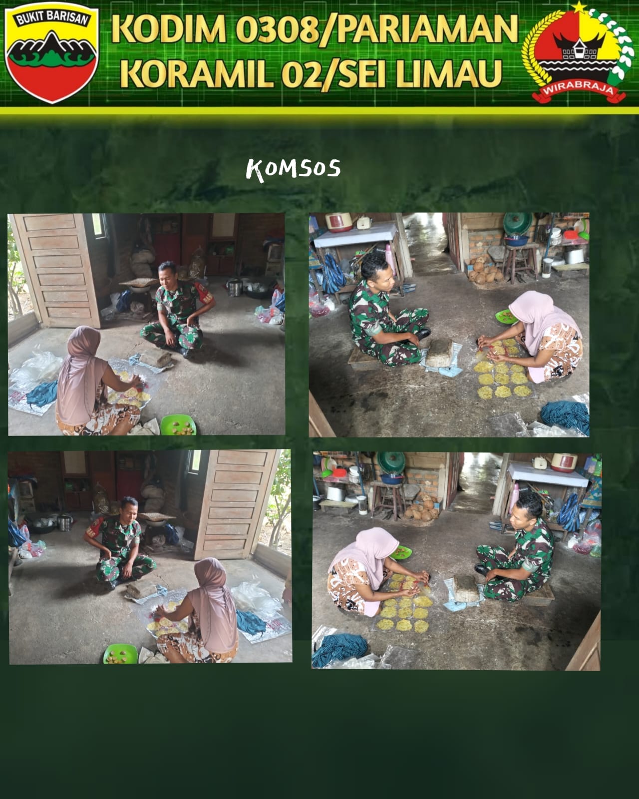 SUNGAI LIMAU, – Babinsa Koramil 02/Sungai Limau Kodim 0308/Pariaman Sertu M. Rizky melaksanakan kegiatan komunikasi sosial (Komsos) bersama ibuk ita terkait Pengembangan Usaha Kerupuk Jariang di Korong Malai V koto Timur.