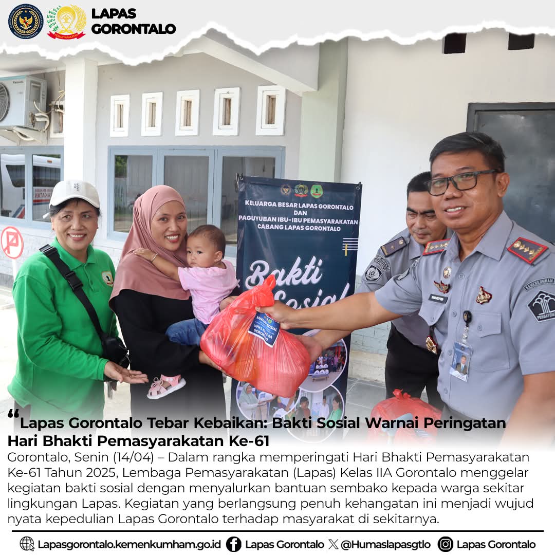 Gorontalo — Dalam rangka memperingati Hari Bhakti Pemasyarakatan Ke-61, Lapas Kelas IIA Gorontalo bersama Paguyuban Ibu-Ibu Pemasyarakatan (PIPAS) Cabang Lapas Gorontalo melaksanakan kegiatan bhakti sosial bagi bagi sembako kepada masyarakat sekitar lapas yang sering terdampak bajir apabila intensitas hujan tinggi, Senin (14/04).