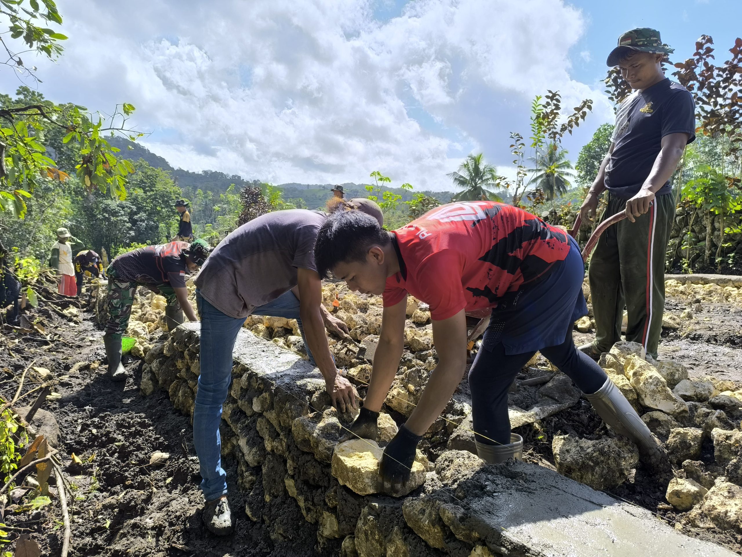 Dengan penuh semangat, anggota TNI, Polri, dan warga setempat bahu-membahu menata batu pondasi untuk pembangunan jalan penghubung desa. Kegiatan ini merupakan bagian dari program TMMD ke-125 yang bertujuan untuk meningkatkan aksesibilitas dan mempercepat pembangunan di wilayah pedesaan.