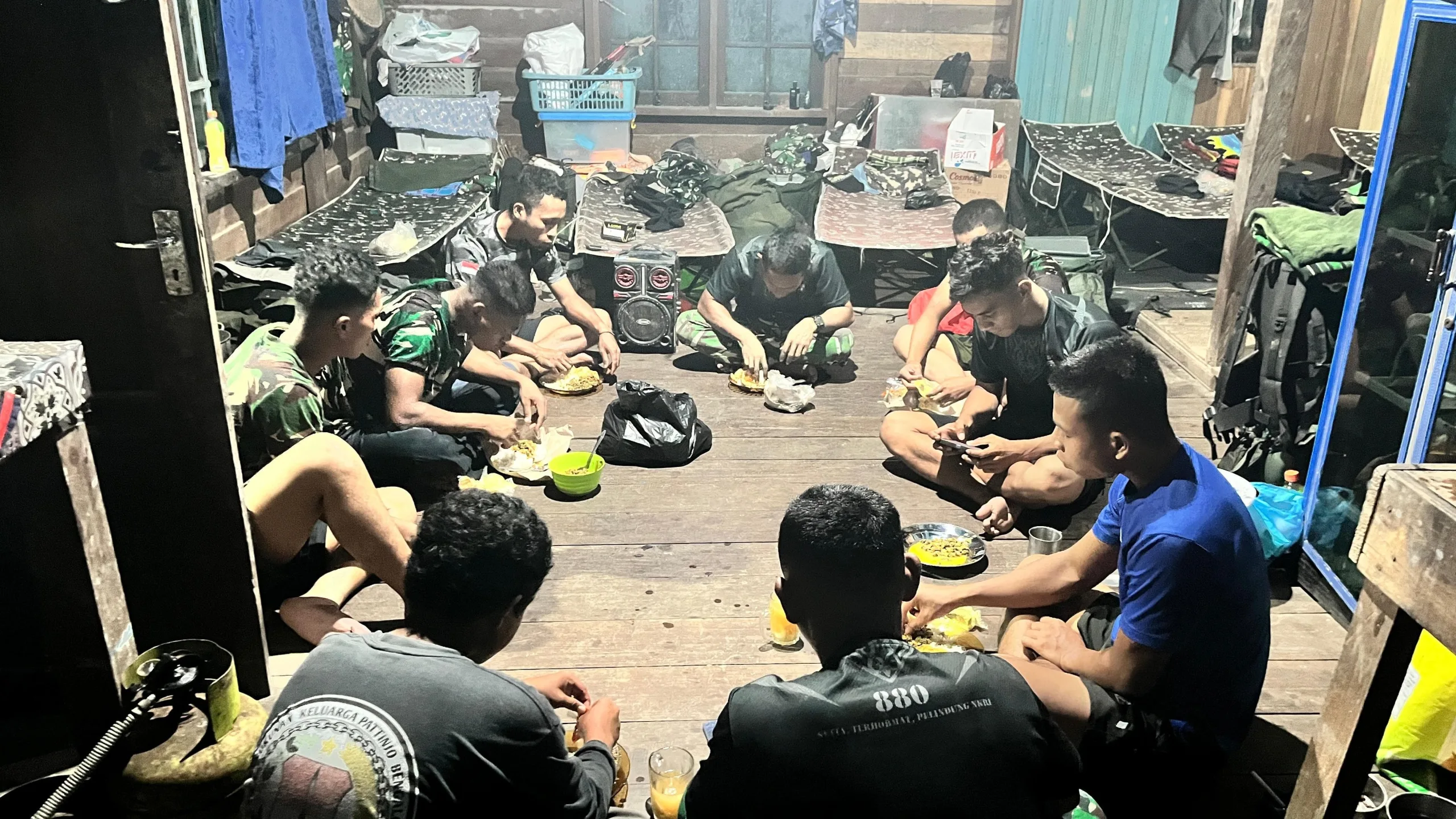 Di tengah kesibukan menjalankan program TMMD, para personel Satgas menyempatkan diri berkumpul bersama untuk menikmati hidangan berbuka puasa. Dengan suasana rumah kayu yang hangat dan penuh kekeluargaan, anggota Satgas dan warga duduk bersama di lantai, menikmati hidangan yang telah disiapkan secara bersama-sama, Senin (23/02).