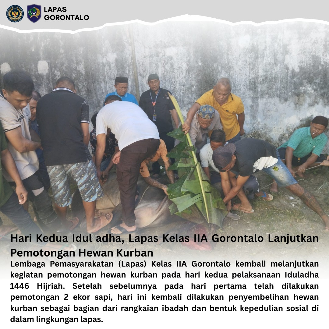 Gorontalo – INFO_PAS – Lembaga Pemasyarakatan (Lapas) Kelas IIA Gorontalo kembali melanjutkan kegiatan pemotongan hewan kurban pada hari kedua pelaksanaan Iduladha 1446 Hijriah. Setelah sebelumnya pada hari pertama telah dilakukan pemotongan 2 ekor sapi, hari ini kembali dilakukan penyembelihan hewan kurban sebagai bagian dari rangkaian ibadah dan bentuk kepedulian sosial di dalam lingkungan lapas.