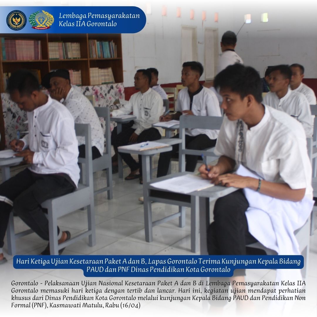 Gorontalo, – Pelaksanaan Ujian Nasional Kesetaraan Paket A dan B di Lembaga Pemasyarakatan Kelas IIA Gorontalo memasuki hari ketiga dengan tertib dan lancar. Hari ini, kegiatan ujian mendapat perhatian khusus dari Dinas Pendidikan Kota Gorontalo melalui kunjungan Kepala Bidang PAUD dan Pendidikan Non Formal (PNF), Kasmawati Matulu, Rabu (16/04).